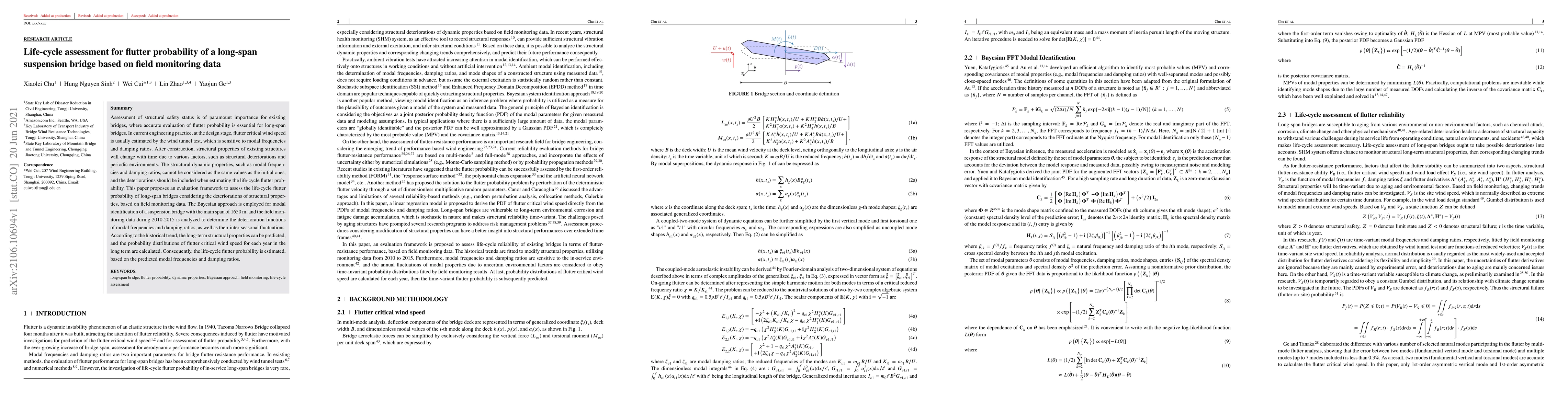 Assessment of structural safety status is of paramount importance for existing bridges, where accurate evaluation of flutter probability is essential for long-span bridges. In current engineering practice, at the design stage, flutter critical wind speed is usually estimated by the wind tunnel test, which is sensitive to modal frequencies and damping ratios. After construction, structural properties of existing structures will change with time due to various factors, such as structural deteriorations and periodic environments. The structural dynamic properties, such as modal frequencies and damping ratios, cannot be considered as the same values as the initial ones, and the deteriorations should be included when estimating the life-cycle flutter probability. This paper proposes an evaluation framework to assess the life-cycle flutter probability of long-span bridges considering the deteriorations of structural properties, based on field monitoring data. The Bayesian approach is employed for modal identification of a suspension bridge with the main span of 1650 m, and the field monitoring data during 2010-2015 is analyzed to determine the deterioration functions of modal frequencies and damping ratios, as well as their inter-seasonal fluctuations. According to the historical trend, the long-term structural properties can be predicted, and the probability distributions of flutter critical wind speed for each year in the long term are calculated. Consequently, the life-cycle flutter probability is estimated, based on the predicted modal frequencies and damping ratios.