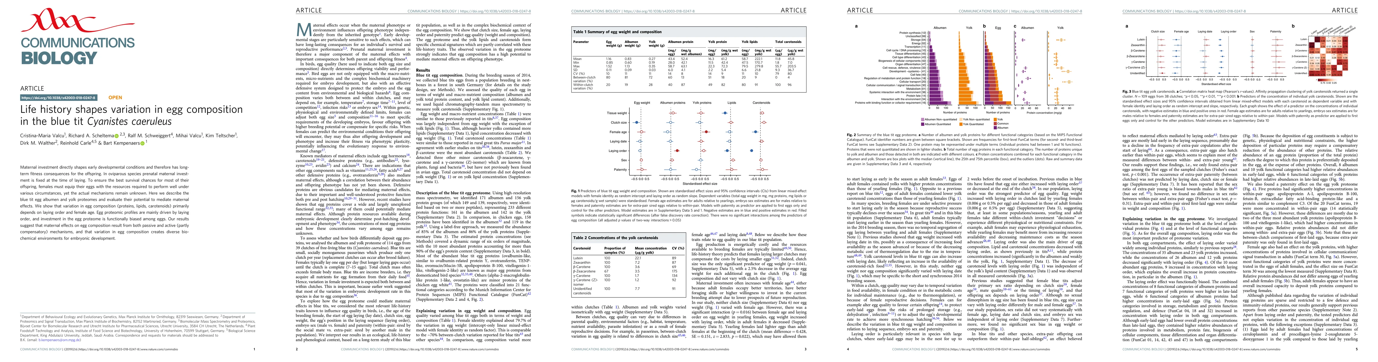 This research investigates how life history traits, such as laying order and female age, influence the composition of blue tit eggs, specifically focusing on proteomes in the albumen and yolk. It concludes that egg composition variations, including proteins, lipids, and carotenoids, are primarily shaped by these life history factors, creating diverse biochemical environments for embryonic development through both passive and active mechanisms.