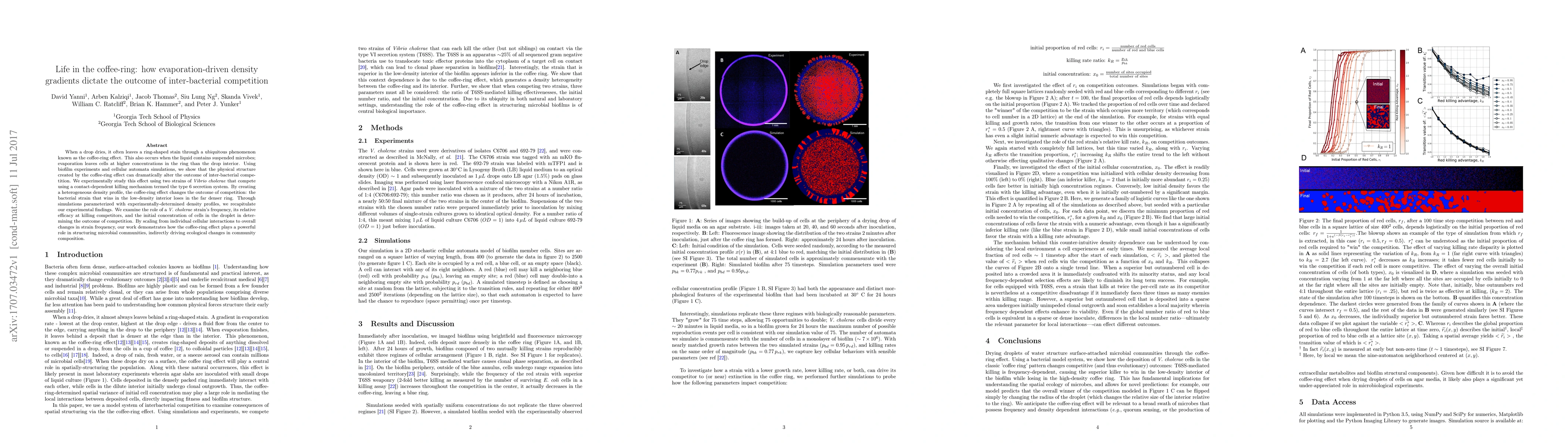 When a drop dries, it often leaves a ring-shaped stain through a ubiquitous phenomenon known as the coffee-ring effect. This also occurs when the liquid contains suspended microbes; evaporation leaves cells at higher concentrations in the ring than the drop interior. Using biofilm experiments and cellular automata simulations, we show that the physical structure created by the coffee-ring effect can dramatically alter the outcome of inter-bacterial competition. We experimentally study this effect using two strains of $\textit{Vibrio cholerae}$ that compete using a contact-dependent killing mechanism termed the type 6 secretion system. By creating a heterogeneous density profile, the coffee-ring effect changes the outcome of competition: the bacterial strain that wins in the low-density interior loses in the far denser ring. Through simulations parameterized with experimentally-determined density profiles, we recapitulate our experimental findings. We examine the role of a $\textit{V. cholerae}$ strain's frequency, its relative efficacy at killing competitors, and the initial concentration of cells in the droplet in determining the outcome of competition. By scaling from individual cellular interactions to overall changes in strain frequency, our work demonstrates how the coffee-ring effect plays a powerful role in structuring microbial communities, indirectly driving ecological changes in community composition.