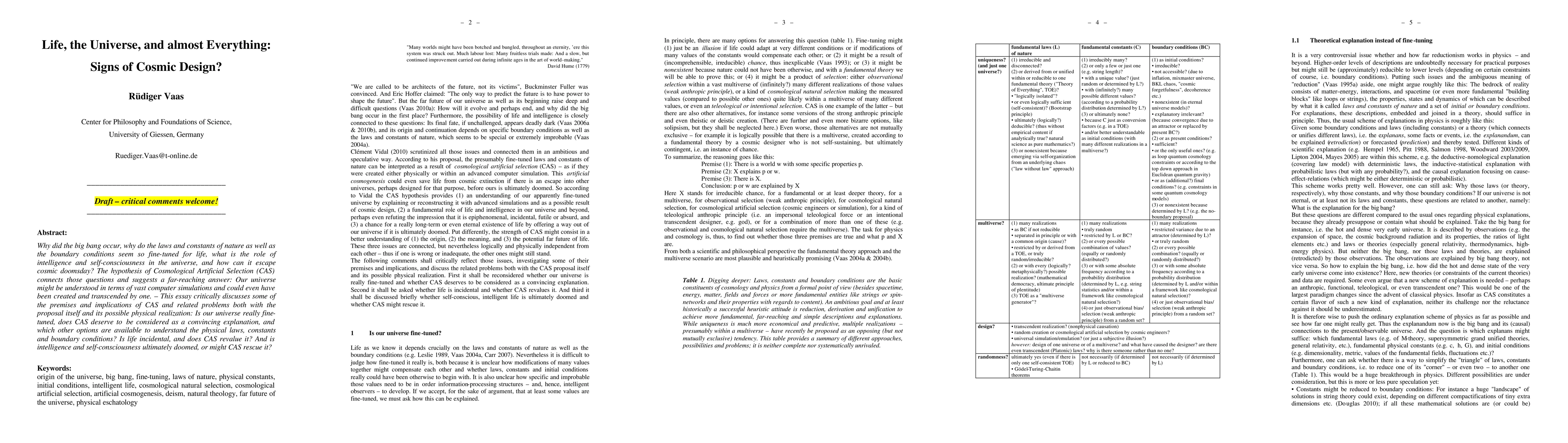 Why did the big bang occur, why do the laws and constants of nature as well as the boundary conditions seem so fine-tuned for life, what is the role of intelligence and self-consciousness in the universe, and how can it escape cosmic doomsday? The hypothesis of Cosmological Artificial Selection (CAS) connects those questions and suggests a far-reaching answer: Our universe might be understood in terms of vast computer simulations and could even have been created and transcended by one. - This essay critically discusses some of the premises and implications of CAS and related problems both with the proposal itself and its possible physical realization: Is our universe really fine-tuned, does CAS deserve to be considered as a convincing explanation, and which other options are available to understand the physical laws, constants and boundary conditions? Is life incidental, and does CAS revalue it? And is intelligence and self-consciousness ultimately doomed, or might CAS rescue it? Keywords: origin of the universe, big bang, fine-tuning, laws of nature, physical constants, initial conditions, intelligent life, cosmological natural selection, cosmological artificial selection, artificial cosmogenesis, deism, natural theology, far future of the universe, physical eschatology