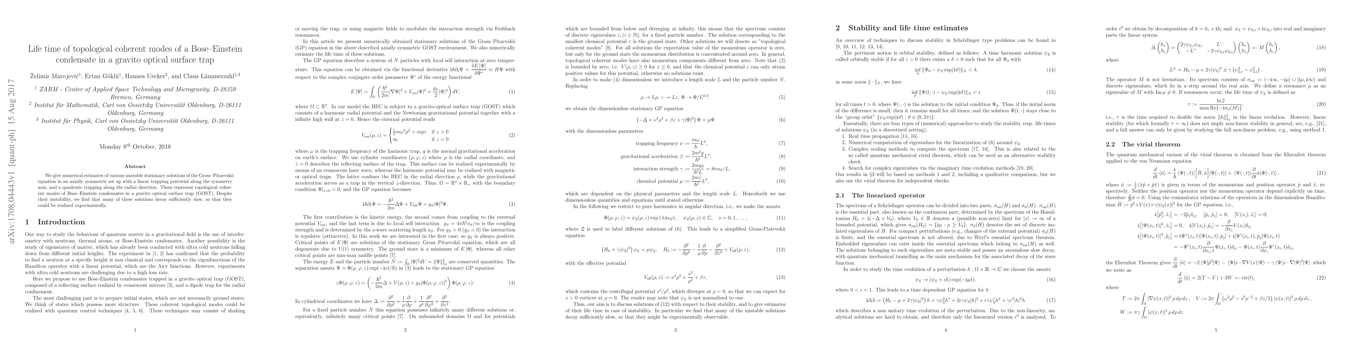 This paper numerically estimates unstable stationary solutions of the Gross-Pitaevskii equation in a gravito optical surface trap, revealing that despite their instability, many topological coherent modes of Bose-Einstein condensates decay slowly enough to potentially be realized experimentally.