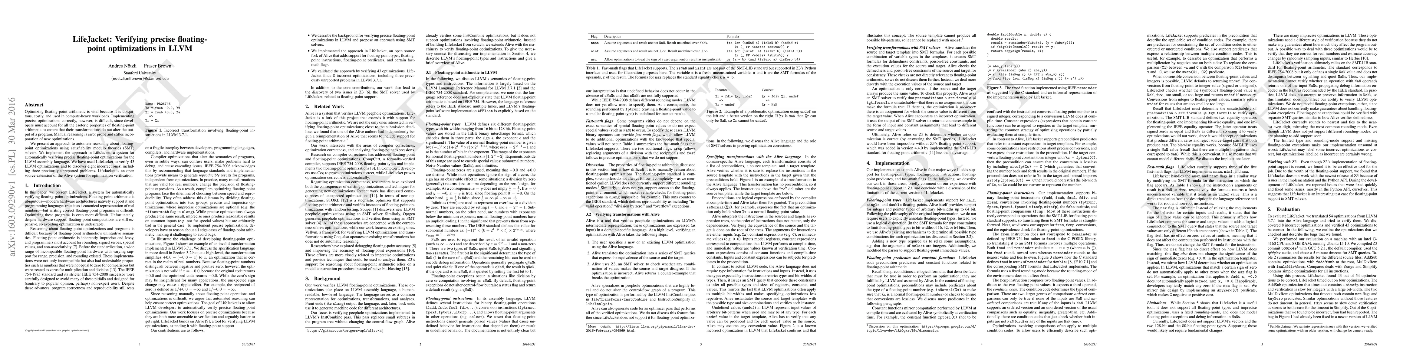 LifeJacket automates the verification of precise floating-point optimizations in LLVM using SMT solvers, successfully verifying 43 optimizations and uncovering eight incorrect ones, including three previously unreported issues. It extends the Alive system to address the complexities of floating-point arithmetic.