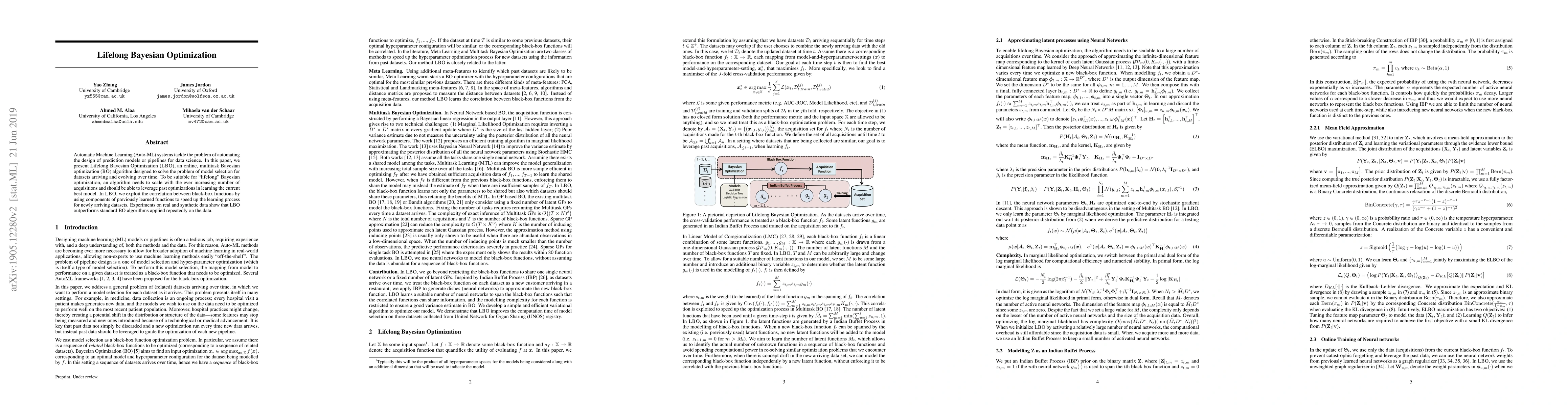 The paper introduces Lifelong Bayesian Optimization (LBO), an online multitask algorithm for model selection in evolving datasets, leveraging past optimizations to scale efficiently. Experiments demonstrate LBO's superior performance over standard Bayesian optimization methods.