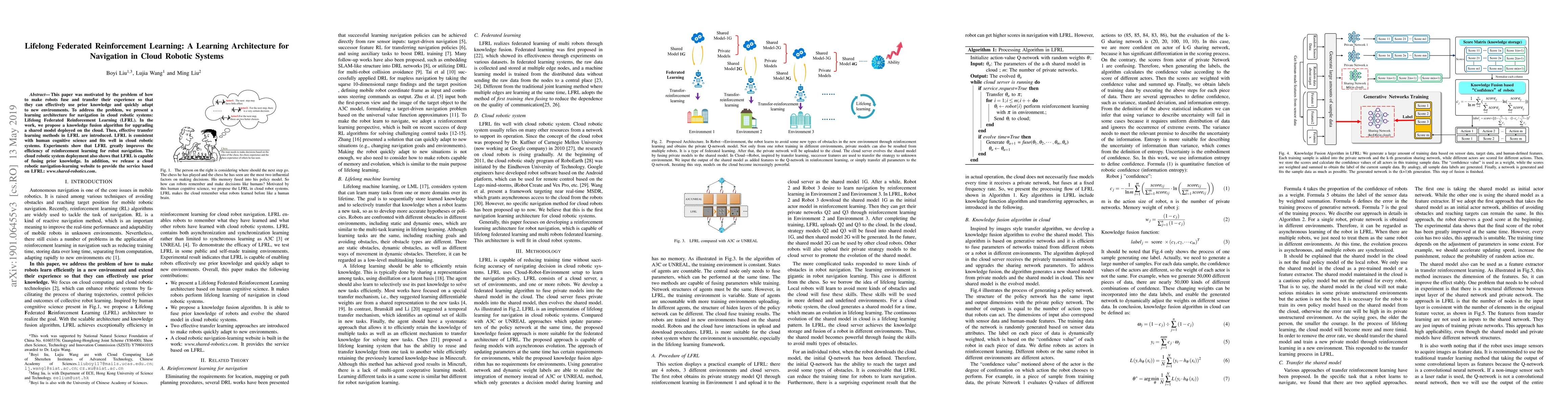 This paper introduces Lifelong Federated Reinforcement Learning (LFRL) to enable robots to efficiently adapt to new environments by fusing and transferring experience. Experiments demonstrate that LFRL significantly enhances navigation efficiency in cloud robotic systems, and the authors have released a dedicated learning website based on this architecture.