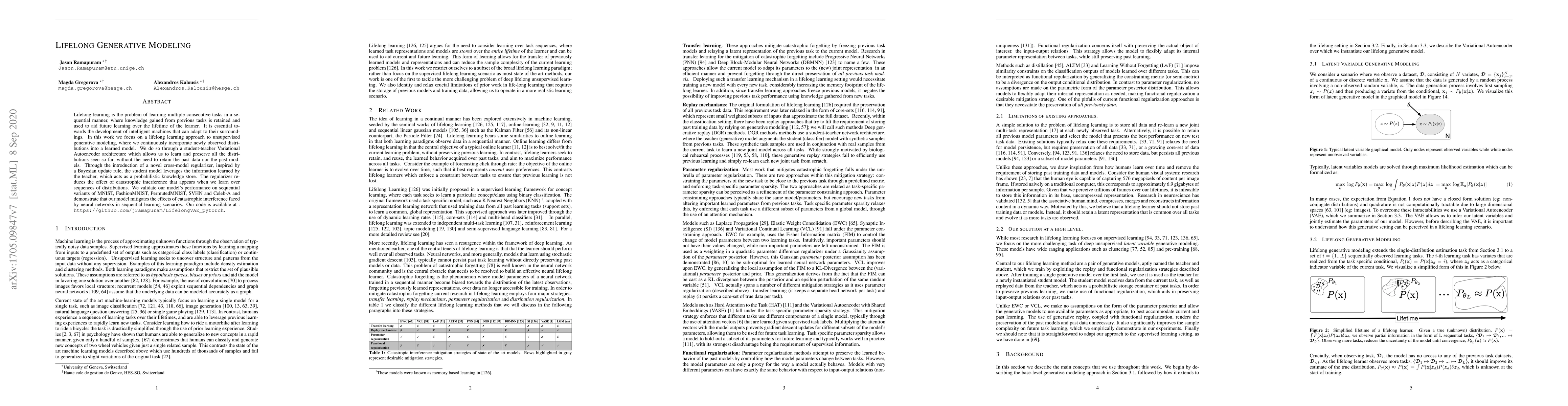 This paper proposes a lifelong learning approach using a student-teacher Variational Autoencoder architecture for unsupervised generative modeling, which incorporates new data distributions without retaining old data. A novel cross-model regularizer reduces catastrophic interference, demonstrated effectively on various sequential datasets.