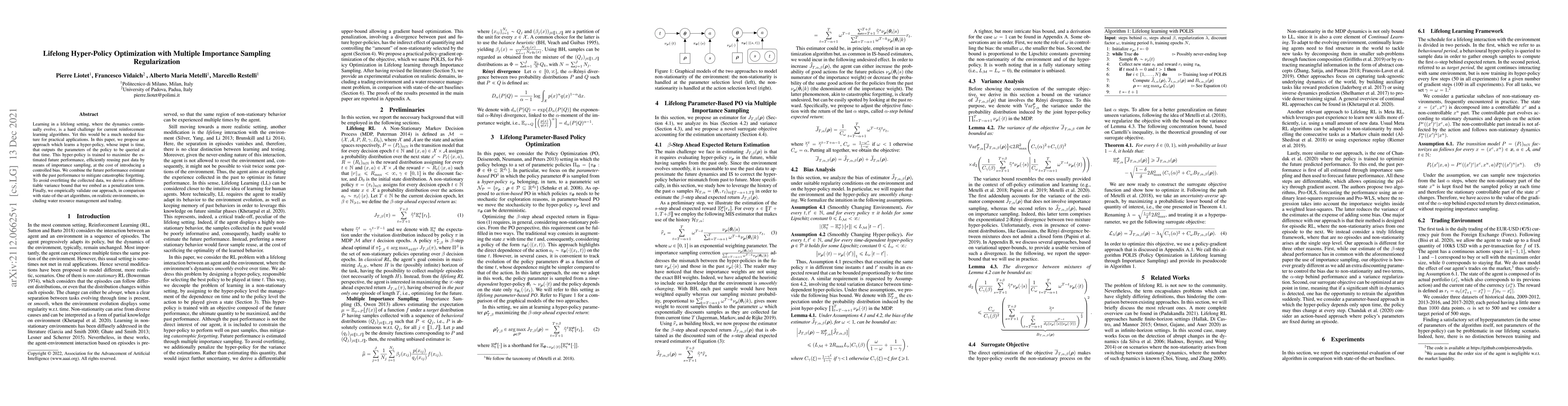 This paper proposes a lifelong reinforcement learning approach that learns a hyper-policy to optimize policy parameters over time, combining past and future performance estimates while mitigating catastrophic forgetting and regularization.