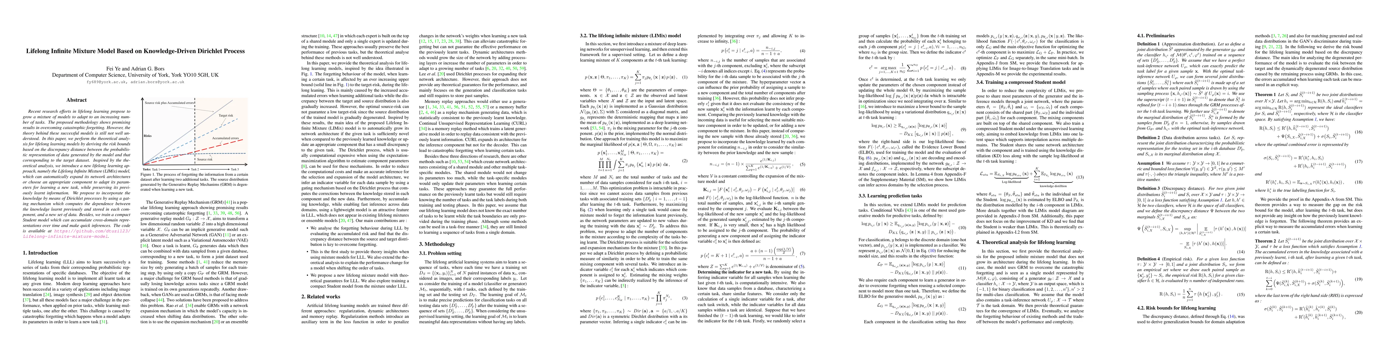 Recent research efforts in lifelong learning propose to grow a mixture of models to adapt to an increasing number of tasks. The proposed methodology shows promising results in overcoming catastrophic forgetting. However, the theory behind these successful models is still not well understood. In this paper, we perform the theoretical analysis for lifelong learning models by deriving the risk bounds based on the discrepancy distance between the probabilistic representation of data generated by the model and that corresponding to the target dataset. Inspired by the theoretical analysis, we introduce a new lifelong learning approach, namely the Lifelong Infinite Mixture (LIMix) model, which can automatically expand its network architectures or choose an appropriate component to adapt its parameters for learning a new task, while preserving its previously learnt information. We propose to incorporate the knowledge by means of Dirichlet processes by using a gating mechanism which computes the dependence between the knowledge learnt previously and stored in each component, and a new set of data. Besides, we train a compact Student model which can accumulate cross-domain representations over time and make quick inferences. The code is available at https://github.com/dtuzi123/Lifelong-infinite-mixture-model.
