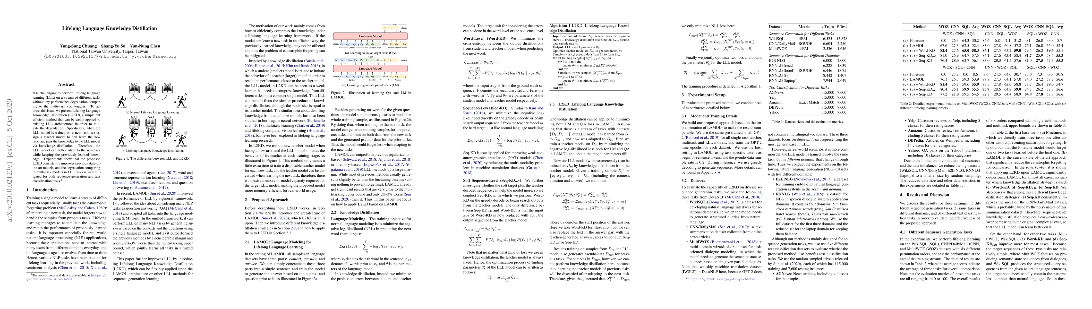 This paper proposes Lifelong Language Knowledge Distillation (L2KD) to mitigate performance degradation in lifelong language learning (LLL) models. L2KD employs a teacher model to distill knowledge into the LLL model during new task training, thereby improving task adaptation while preserving previously acquired knowledge. Experimental results demonstrate L2KD's effectiveness in reducing degradation compared to multi-task models in both sequence generation and text classification tasks.