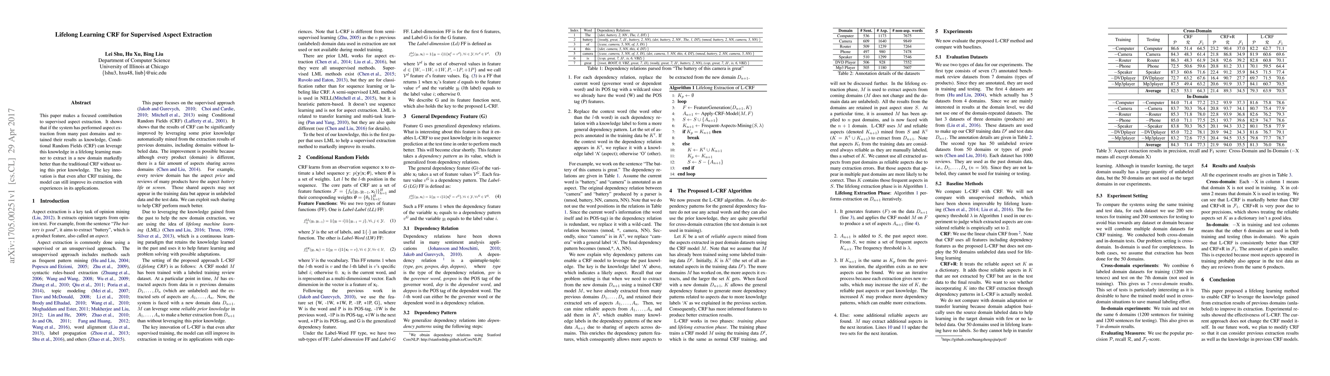 This paper introduces a Lifelong Learning Conditional Random Fields (CRF) approach for supervised aspect extraction, demonstrating significant improvements over traditional CRF by leveraging knowledge from past domains to enhance performance in new domains. The model continues to improve its extraction capabilities through continual learning experiences.