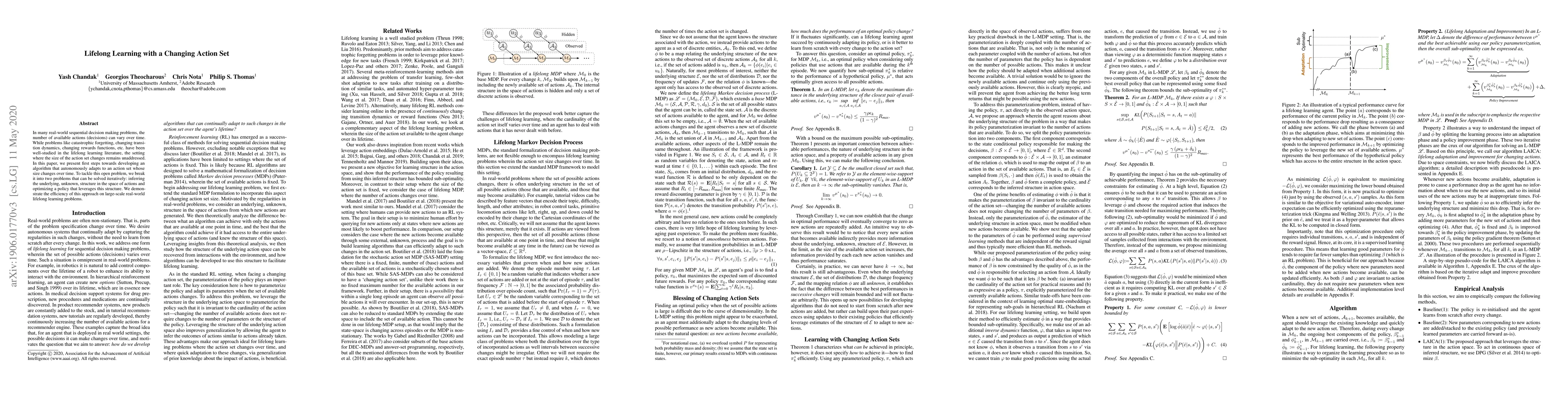 In many real-world sequential decision making problems, the number of available actions (decisions) can vary over time. While problems like catastrophic forgetting, changing transition dynamics, changing rewards functions, etc. have been well-studied in the lifelong learning literature, the setting where the action set changes remains unaddressed. In this paper, we present an algorithm that autonomously adapts to an action set whose size changes over time. To tackle this open problem, we break it into two problems that can be solved iteratively: inferring the underlying, unknown, structure in the space of actions and optimizing a policy that leverages this structure. We demonstrate the efficiency of this approach on large-scale real-world lifelong learning problems.
