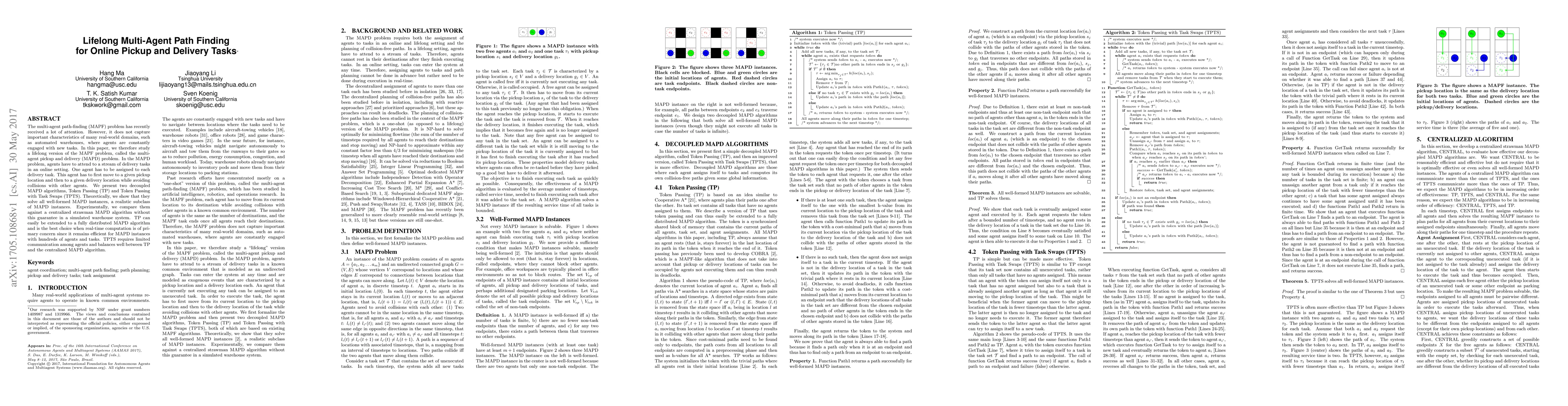 This paper introduces a lifelong multi-agent pickup and delivery (MAPD) problem, addressing the limitations of traditional multi-agent path-finding (MAPF) in dynamic environments. It presents two algorithms, Token Passing (TP) and Token Passing with Task Swaps (TPTS), and demonstrates their effectiveness in solving MAPD instances while avoiding agent collisions.