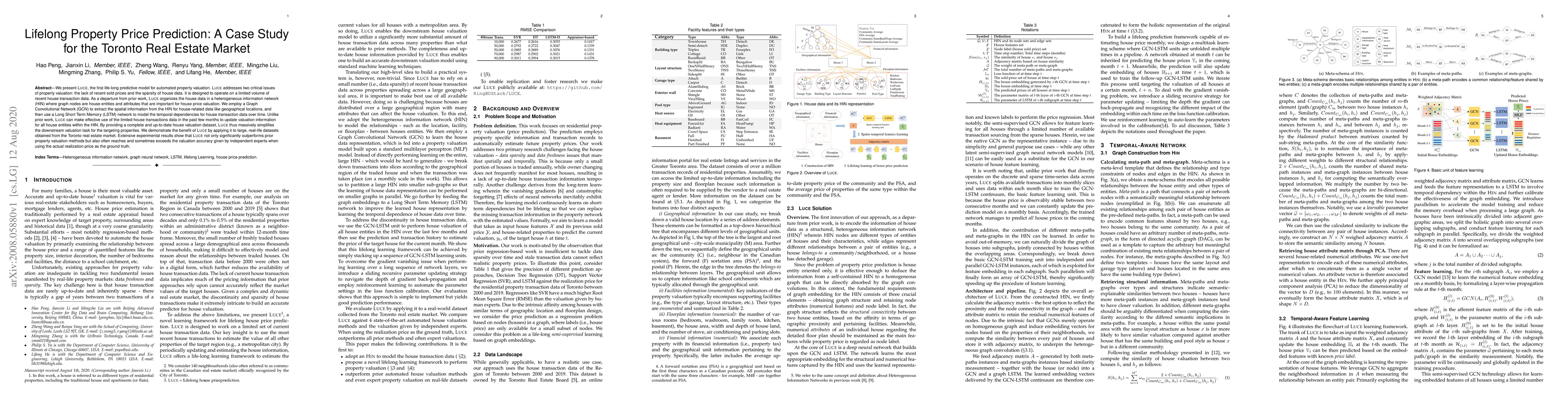 Luce distinguishes itself by focusing on a life-long learning approach for property valuation, employing a HIN to represent house entities and attributes, and combining GCN and LSTM to capture both spatial and temporal dependencies in house transaction data.