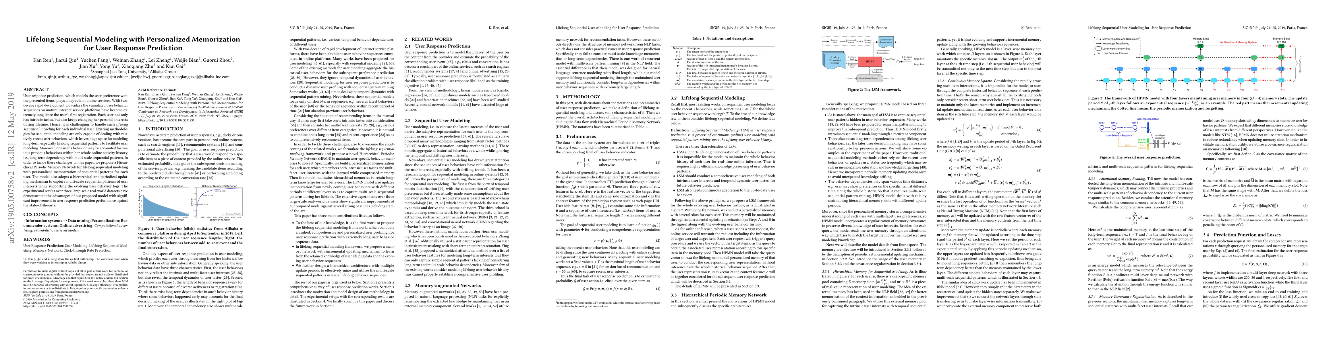 This paper proposes a Hierarchical Periodic Memory Network for lifelong sequential modeling to predict user responses by capturing long-term dependencies and evolving user interests. The model shows significant improvement over state-of-the-art methods in user response prediction on three large-scale datasets.