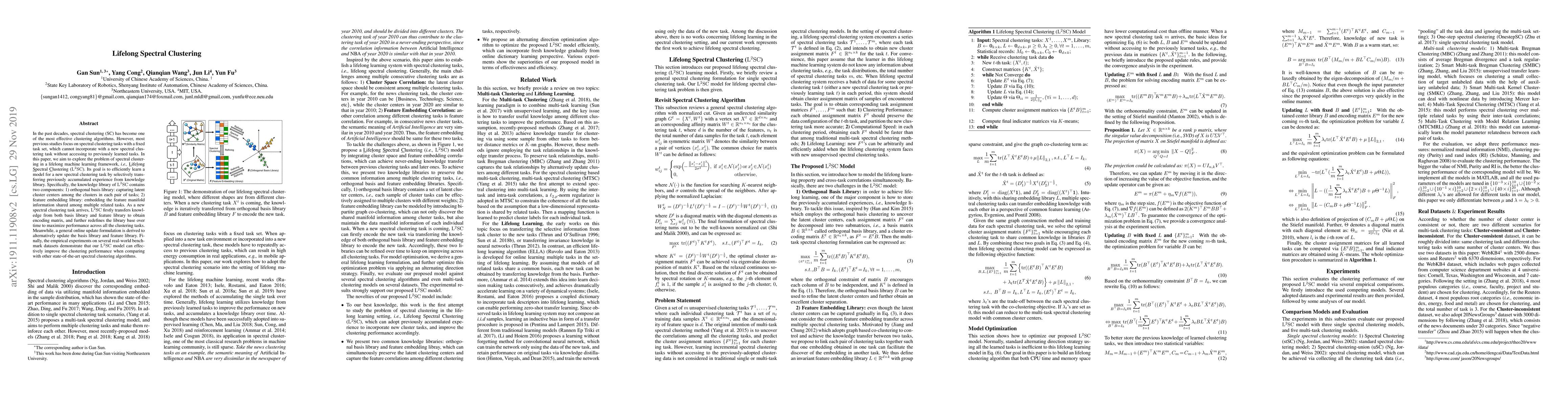 This paper proposes Lifelong Spectral Clustering (L2SC) to address the challenge of incorporating new clustering tasks without losing previously learned knowledge. L2SC leverages an orthogonal basis library and a feature embedding library to transfer relevant knowledge and continuously update the model to maximize performance across all tasks.