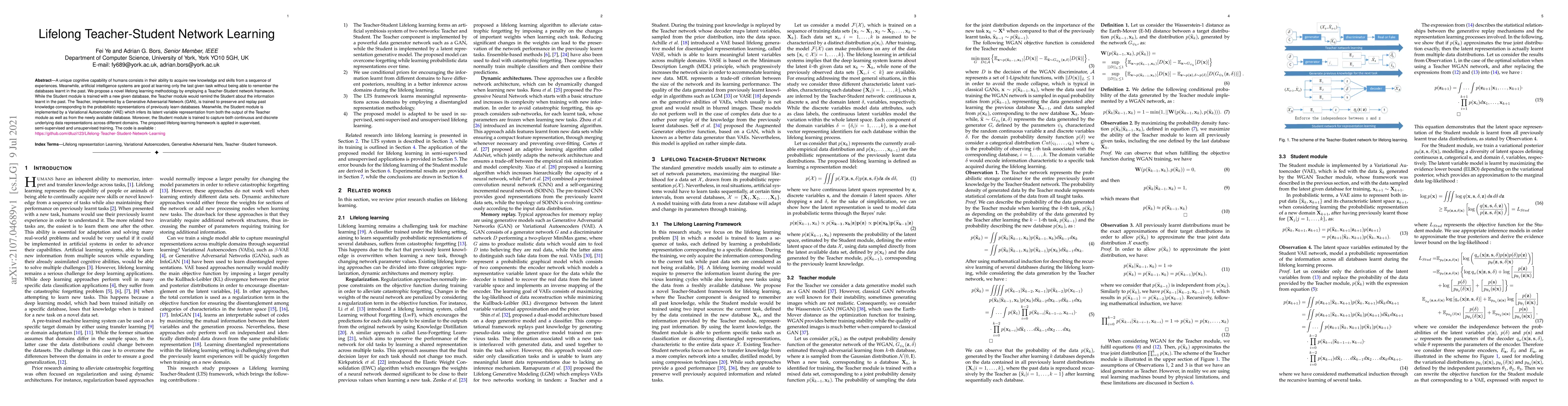 This paper proposes a lifelong learning methodology using a Teacher-Student network where the Teacher, a GAN, retains past knowledge, and the Student, a VAE, learns new data while referencing the Teacher. The framework supports supervised, semi-supervised, and unsupervised training. Code is available for reproducibility.