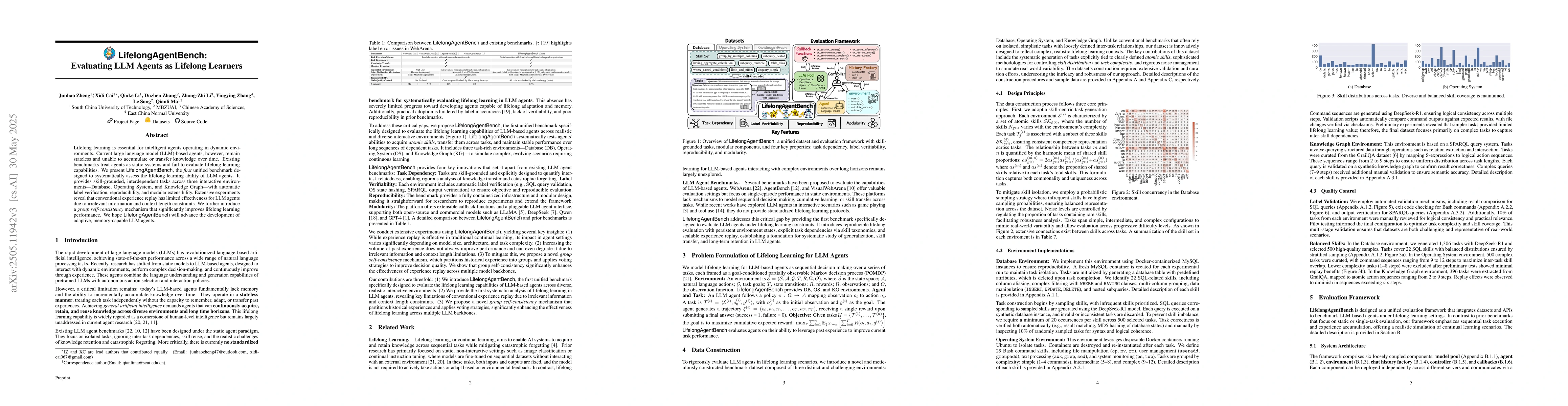 LifelongAgentBench, a benchmark suite for evaluating lifelong learning in LLM agents, along with the group self-consistency mechanism to improve their performance.