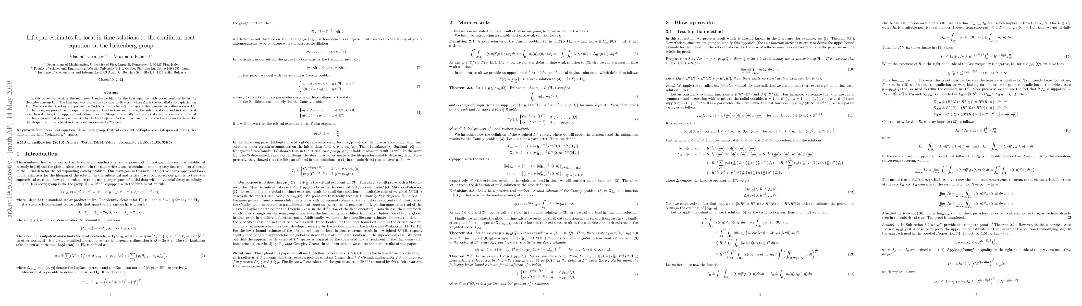 This paper investigates the lifespan of local in time solutions to the semilinear heat equation on the Heisenberg group, proving sharp estimates for both subcritical and critical cases. The Fujita exponent is shown to be critical, and new methods are employed to derive upper and lower bound estimates for the solution's lifespan.