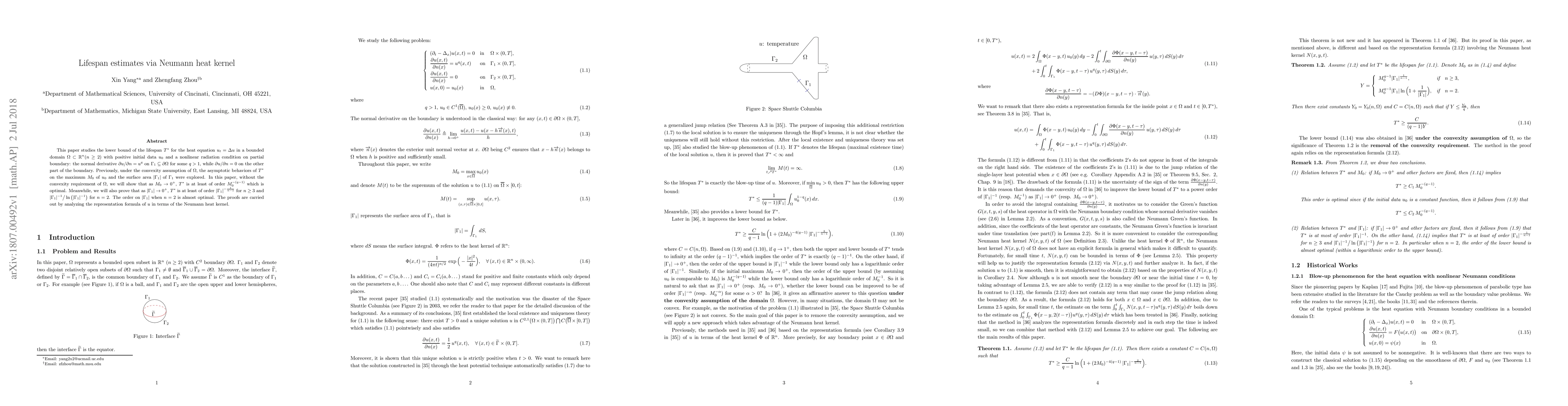 This paper studies the lower bound of the lifespan $T^{*}$ for the heat equation $u_t=\Delta u$ in a bounded domain $\Omega\subset\mathbb{R}^{n}(n\geq 2)$ with positive initial data $u_{0}$ and a nonlinear radiation condition on partial boundary: the normal derivative $\partial u/\partial n=u^{q}$ on $\Gamma_1\subseteq \partial\Omega$ for some $q>1$, while $\partial u/\partial n=0$ on the other part of the boundary. Previously, under the convexity assumption of $\Omega$, the asymptotic behaviors of $T^{*}$ on the maximum $M_{0}$ of $u_{0}$ and the surface area $|\Gamma_{1}|$ of $\Gamma_{1}$ were explored. In this paper, without the convexity requirement of $\Omega$, we will show that as $M_{0}\rightarrow 0^{+}$, $T^{*}$ is at least of order $M_{0}^{-(q-1)}$ which is optimal. Meanwhile, we will also prove that as $|\Gamma_{1}|\rightarrow 0^{+}$, $T^{*}$ is at least of order $|\Gamma_{1}|^{-\frac{1}{n-1}}$ for $n\geq 3$ and $|\Gamma_{1}|^{-1}\big/\ln\big(|\Gamma_{1}|^{-1}\big)$ for $n=2$. The order on $|\Gamma_{1}|$ when $n=2$ is almost optimal. The proofs are carried out by analyzing the representation formula of $u$ in terms of the Neumann heat kernel.