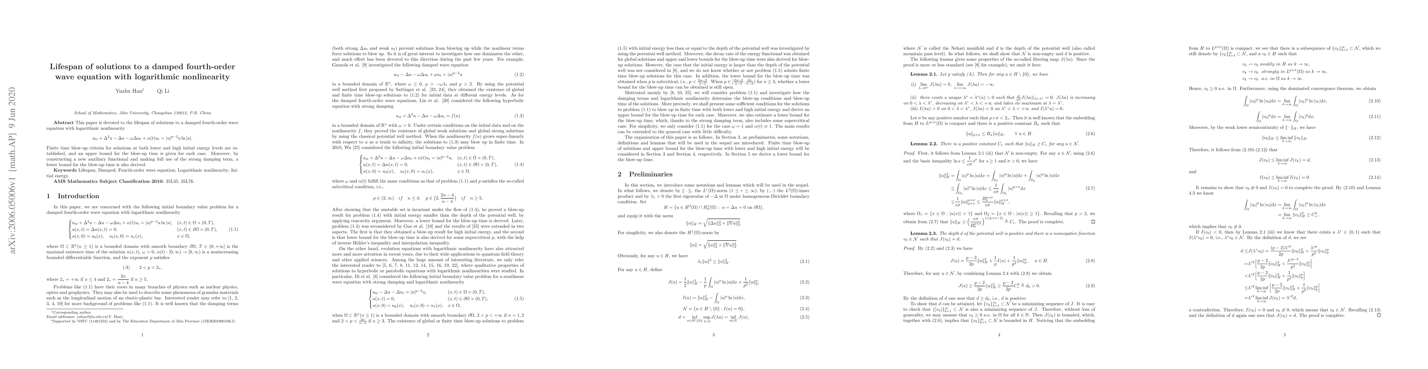 This paper investigates the lifespan of solutions to a damped fourth-order wave equation with logarithmic nonlinearity, establishing criteria for finite time blow-up at both low and high initial energy levels, and providing upper and lower bounds for the blow-up time.