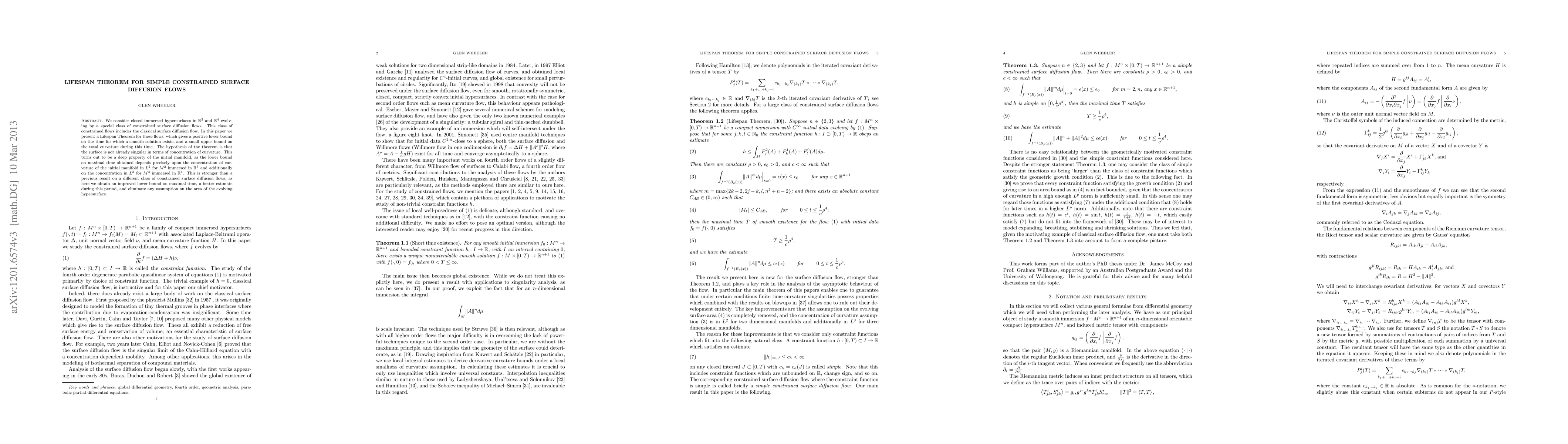 We consider closed immersed hypersurfaces in $\R^3$ and $\R^4$ evolving by a special class of constrained surface diffusion flows. This class of constrained flows includes the classical surface diffusion flow. In this paper we present a Lifespan Theorem for these flows, which gives a positive lower bound on the time for which a smooth solution exists, and a small upper bound on the total curvature during this time. The hypothesis of the theorem is that the surface is not already singular in terms of concentration of curvature. This turns out to be a deep property of the initial manifold, as the lower bound on maximal time obtained depends precisely upon the concentration of curvature of the initial manifold in $L^2$ for $M^2$ immersed in $R^3$ and additionally on the concentration in $L^3$ for $M^3$ immersed in $R^4$. This is stronger than a previous result on a different class of constrained surface diffusion flows, as here we obtain an improved lower bound on maximal time, a better estimate during this period, and eliminate any assumption on the area of the evolving hypersurface.