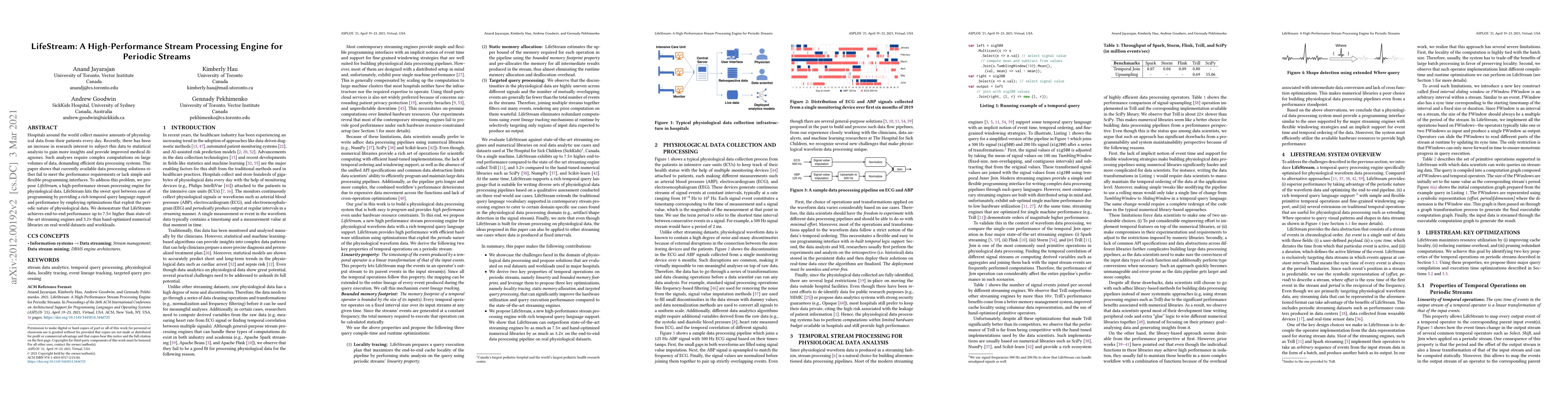 LifeStream is a high-performance stream processing engine designed for analyzing periodic physiological data from hospitals. It offers a balance between ease of programming and performance, achieving up to 7.5 times better performance than existing streaming engines and 3.2 times better than hand-optimized libraries.