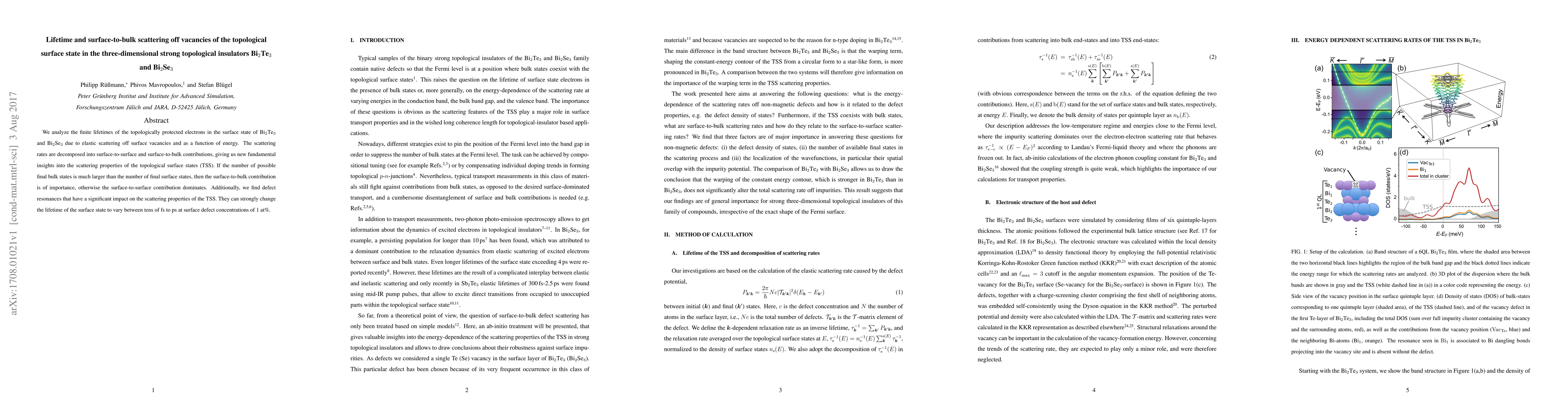 Researchers studied how electrons in topological insulators interact with surface vacancies, revealing new insights into their scattering properties. They found that defects can cause a significant impact on the lifetime of these electrons, varying from tens of fs to ps.
