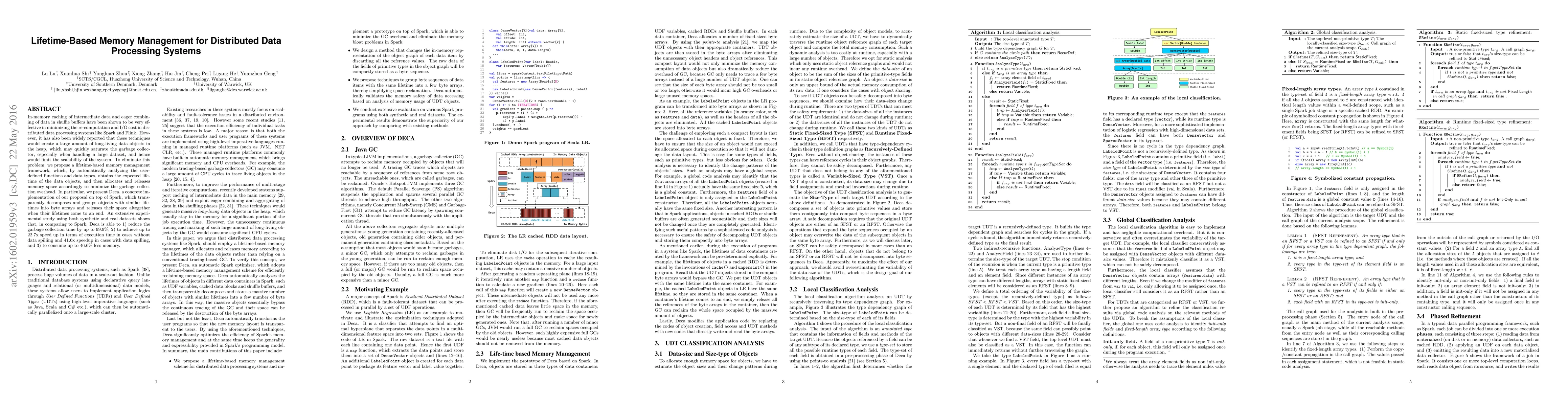In-memory caching of intermediate data and eager combining of data in shuffle buffers have been shown to be very effective in minimizing the re-computation and I/O cost in distributed data processing systems like Spark and Flink. However, it has also been widely reported that these techniques would create a large amount of long-living data objects in the heap, which may quickly saturate the garbage collector, especially when handling a large dataset, and hence would limit the scalability of the system. To eliminate this problem, we propose a lifetime-based memory management framework, which, by automatically analyzing the user-defined functions and data types, obtains the expected lifetime of the data objects, and then allocates and releases memory space accordingly to minimize the garbage collection overhead. In particular, we present Deca, a concrete implementation of our proposal on top of Spark, which transparently decomposes and groups objects with similar lifetimes into byte arrays and releases their space altogether when their lifetimes come to an end. An extensive experimental study using both synthetic and real datasets shows that, in comparing to Spark, Deca is able to 1) reduce the garbage collection time by up to 99.9%, 2) to achieve up to 22.7x speed up in terms of execution time in cases without data spilling and 41.6x speedup in cases with data spilling, and 3) to consume up to 46.6% less memory.