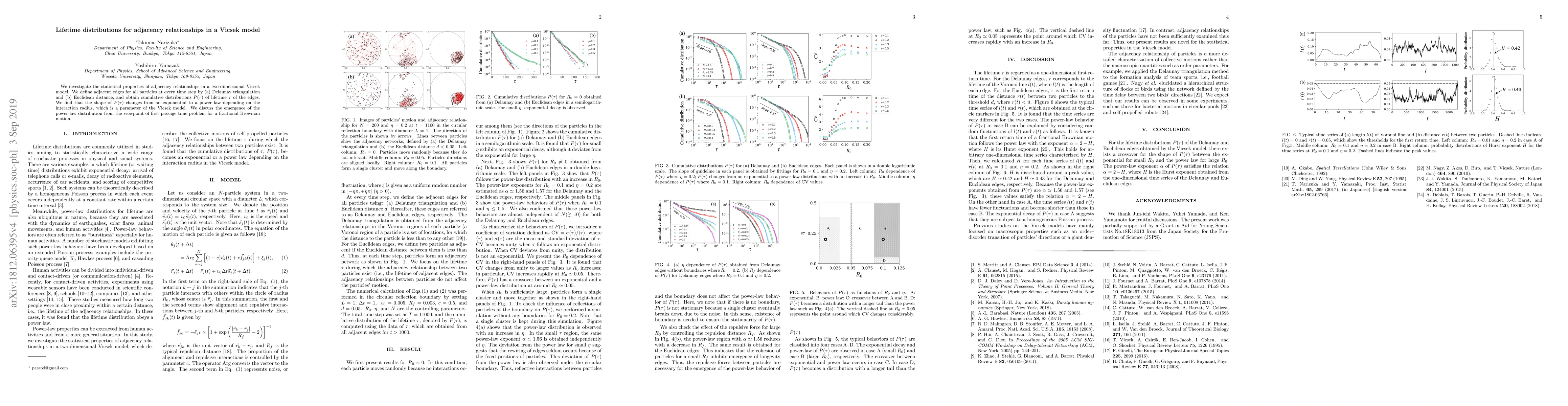 We investigate the statistical properties of adjacency relationships in a two-dimensional Vicsek model. We define adjacent edges for all particles at every time step by (a) Delaunay triangulation and (b) Euclidean distance, and obtain cumulative distributions $ P(\tau) $ of lifetime $ \tau $ of the edges. We find that the shape of $ P(\tau) $ changes from an exponential to a power law depending on the interaction radius, which is a parameter of the Vicsek model. We discuss the emergence of the power-law distribution from the viewpoint of first passage time problem for a fractional Brownian motion.