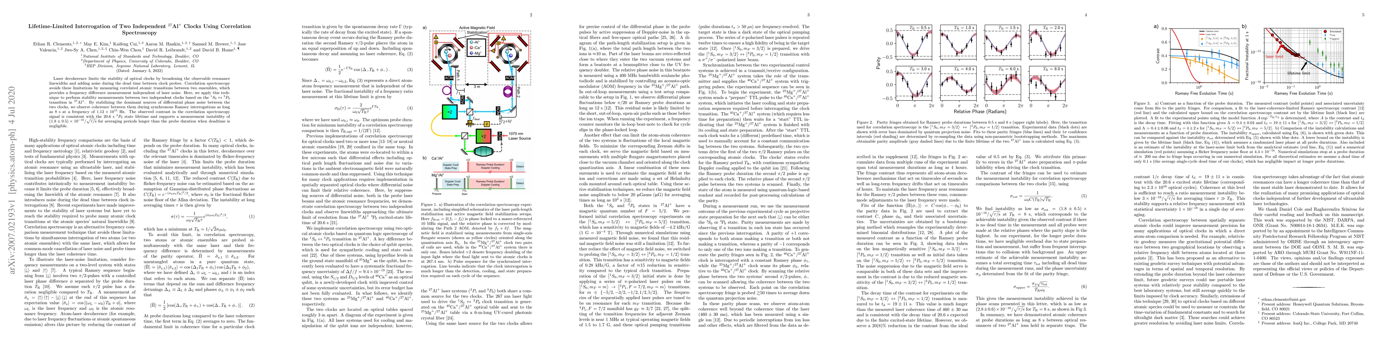 Laser decoherence limits the stability of optical clocks by broadening the observable resonance linewidths and adding noise during the dead time between clock probes. Correlation spectroscopy avoids these limitations by measuring correlated atomic transitions between two ensembles, which provides a frequency difference measurement independent of laser noise. Here, we apply this technique to perform stability measurements between two independent clocks based on the $^1S_0\leftrightarrow{}^3P_0$ transition in $^{27}$Al$^+$. By stabilizing the dominant sources of differential phase noise between the two clocks, we observe coherence between them during synchronous Ramsey interrogations as long as 8 s at a frequency of $1.12\times10^{15}$ Hz. The observed contrast in the correlation spectroscopy signal is consistent with the 20.6 s $^3P_0$ state lifetime and supports a measurement instability of $(1.8\pm0.5)\times 10^{-16}/\sqrt{\tau/\textrm{s}}$ for averaging periods longer than the probe duration when deadtime is negligible.