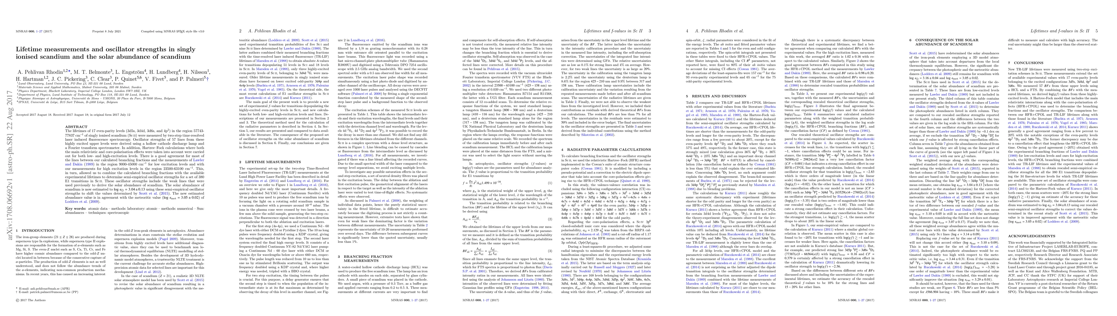 Researchers measured lifetimes of 17 levels in singly ionised scandium and calculated oscillator strengths using Hartree-Fock calculations, resulting in an estimated solar abundance of scandium as log ~τ_θ = 3.04 ± 0.13.