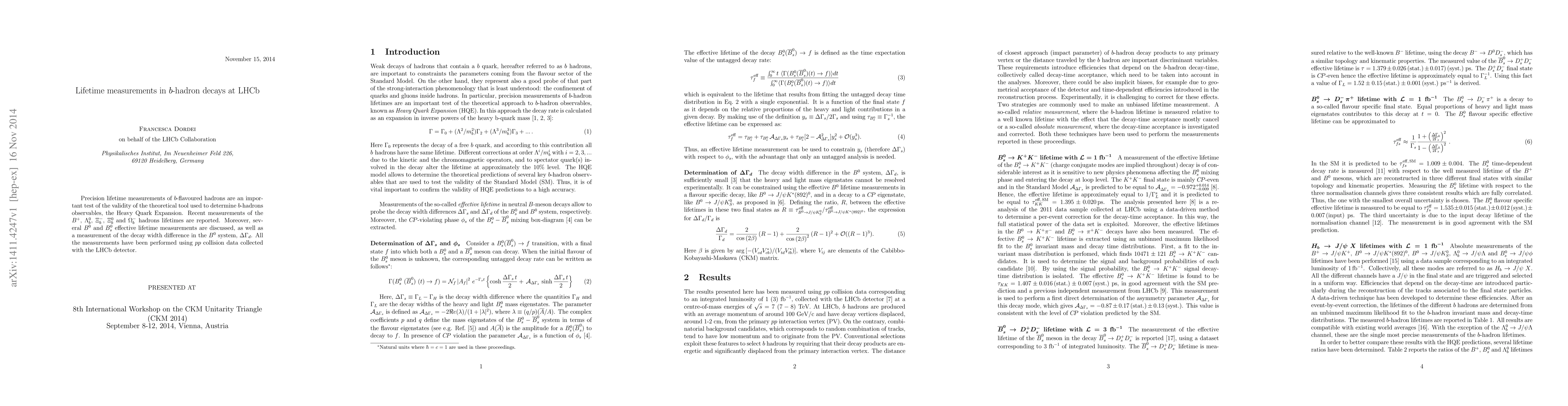 This paper reports precise lifetime measurements of various $b$-hadrons, including $B^+$, $\Lambda^0_b$, $\Xi^-_b$, $\Xi^0_b$, and $\Omega^-_b$, using data from LHCb. It also discusses effective lifetimes for $B^0$ and $B^0_s$ and measures the $B^0$ decay width difference, $\Delta \Gamma_d$, testing the Heavy Quark Expansion theory.