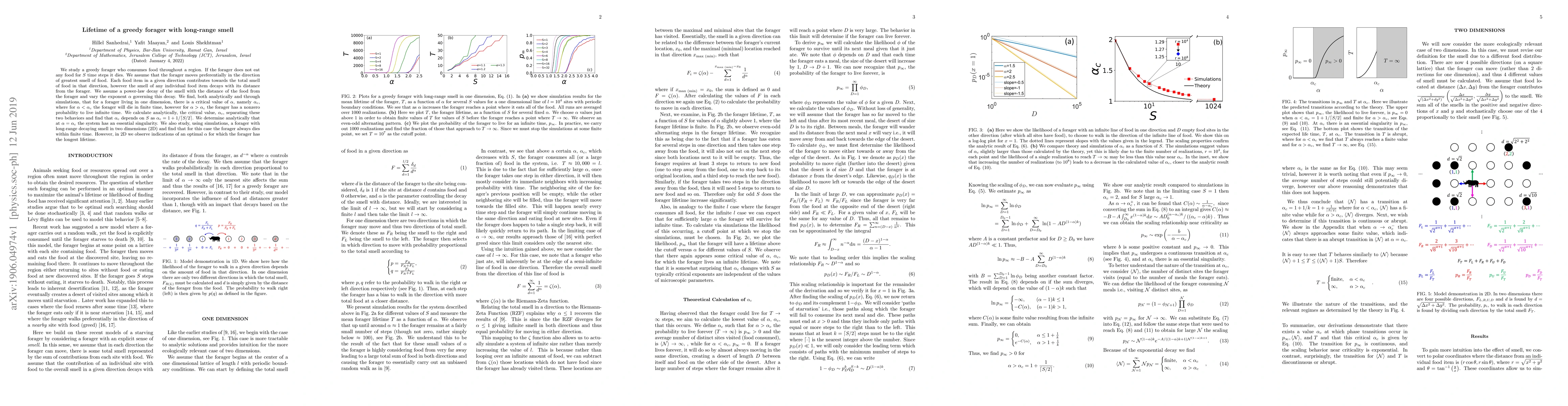 We study a greedy forager who consumes food throughout a region. If the forager does not eat any food for $S$ time steps it dies. We assume that the forager moves preferentially in the direction of greatest smell of food. Each food item in a given direction contributes towards the total smell of food in that direction, however the smell of any individual food item decays with its distance from the forager. We assume a power-law decay of the smell with the distance of the food from the forager and vary the exponent $\alpha$ governing this decay. We find, both analytically and through simulations, that for a forager living in one dimension, there is a critical value of $\alpha$, namely $\alpha_c$, where for $\alpha<\alpha_c$ the forager will die in finite time, however for $\alpha>\alpha_c$ the forager has a nonzero probability to live infinite time. We calculate analytically, the critical value, $\alpha_c$, separating these two behaviors and find that $\alpha_c$ depends on $S$ as $\alpha_c=1 + 1/\lceil S/2 \rceil$. We determine analytically that at $\alpha=\alpha_c$ the system has an essential singularity. We also study, using simulations, a forager with long-range decaying smell in two dimensions (2D) and find that for this case the forager always dies within finite time. However, in 2D we observe indications of an optimal $\alpha$ for which the forager has the longest lifetime.