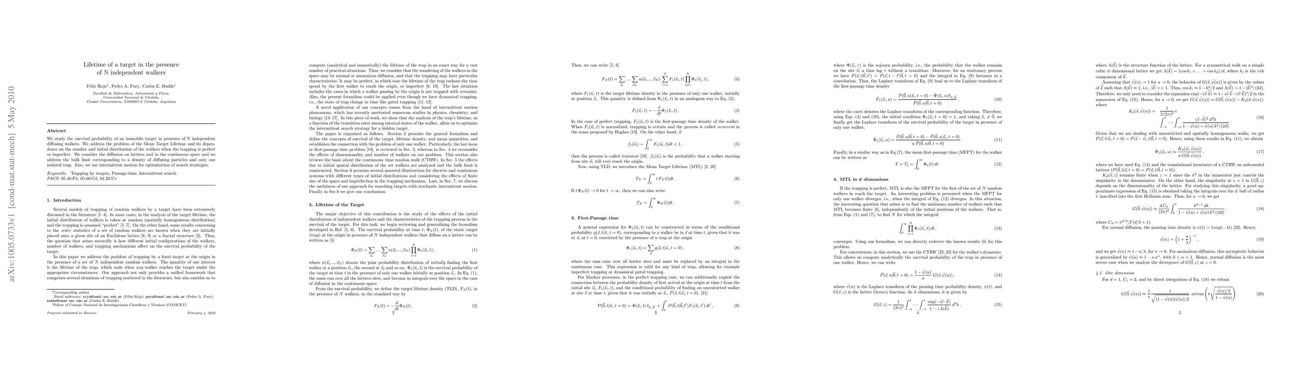 We study the survival probability of an immobile target in presence of N independent diffusing walkers. We address the problem of the Mean Target Lifetime and its dependence on the number and initial distribution of the walkers when the trapping is perfect or imperfect. We consider the diffusion on lattices and in the continuous space and we address the bulk limit corresponding to a density of diffusing particles and only one isolated trap. Also, we use intermittent motion for optimization of search strategies.