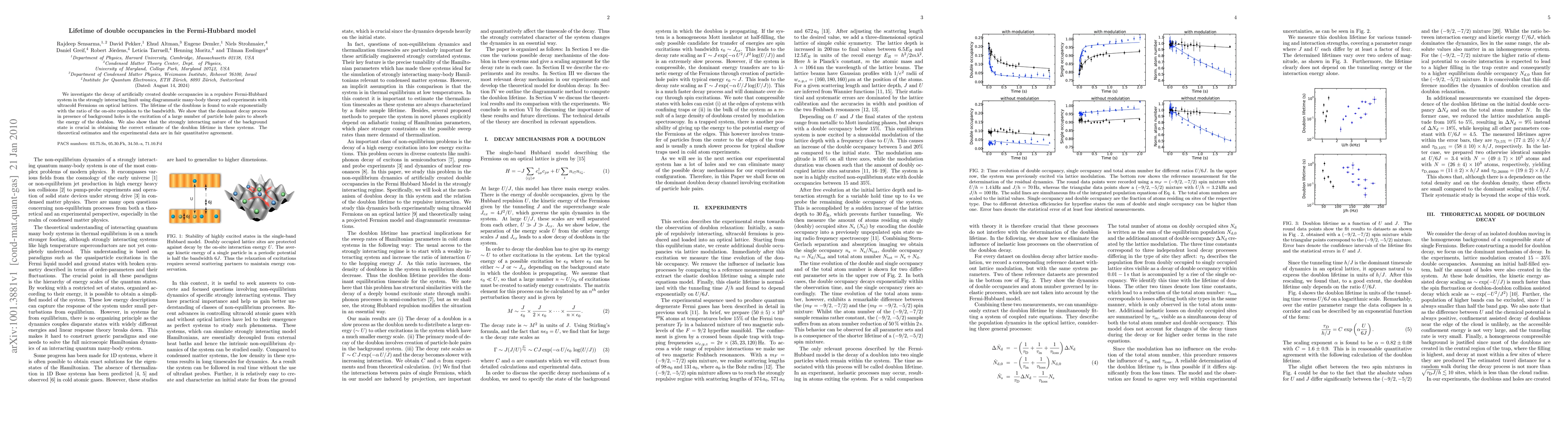 We investigate the decay of artificially created double occupancies in a repulsive Fermi-Hubbard system in the strongly interacting limit using diagrammatic many-body theory and experiments with ultracold fermions on optical lattices. The lifetime of the doublons is found to scale exponentially with the ratio of the on-site repulsion to the bandwidth. We show that the dominant decay process in presence of background holes is the excitation of a large number of particle hole pairs to absorb the energy of the doublon. We also show that the strongly interacting nature of the background state is crucial in obtaining the correct estimate of the doublon lifetime in these systems. The theoretical estimates and the experimental data are in fair quantitative agreement.