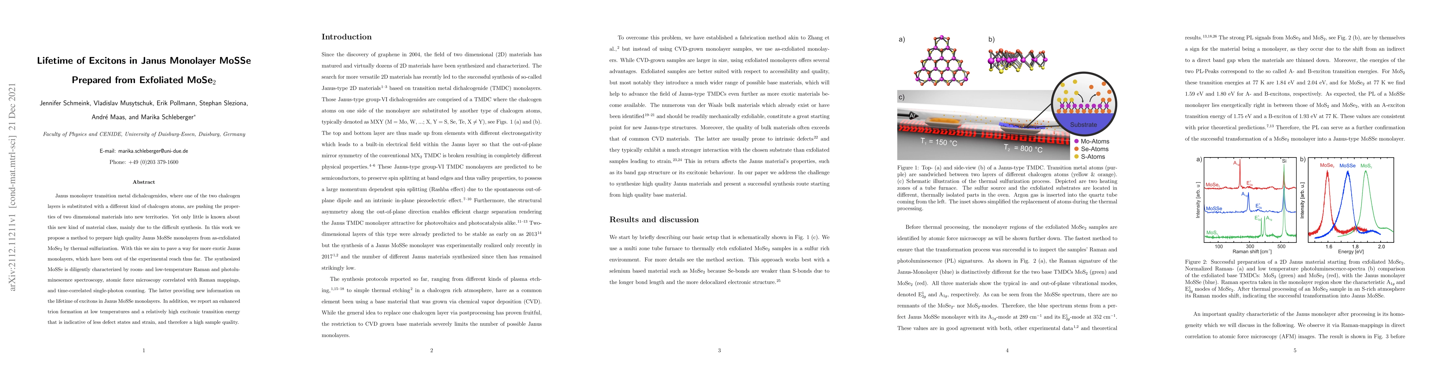 This study presents a method for preparing high-quality Janus MoSSe monolayers from exfoliated MoSe₂ via thermal sulfurization. The research characterizes the material using various spectroscopic and microscopy techniques, revealing a high-quality sample with a relatively long exciton lifetime and enhanced trion formation, indicative of reduced defects and strain.