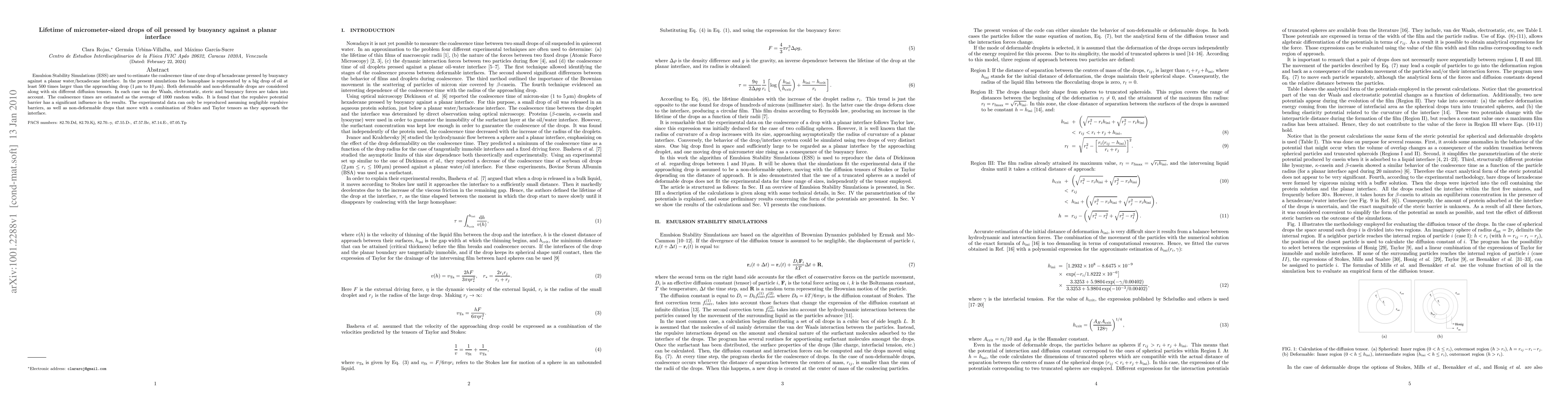 This paper uses Emulsion Stability Simulations to estimate the coalescence time of micrometer-sized oil drops pressed against a water/oil interface, considering both deformable and non-deformable drops. The study finds that negligible repulsive barriers and non-deformable drops moving via Stokes and Taylor tensors best match experimental data.
