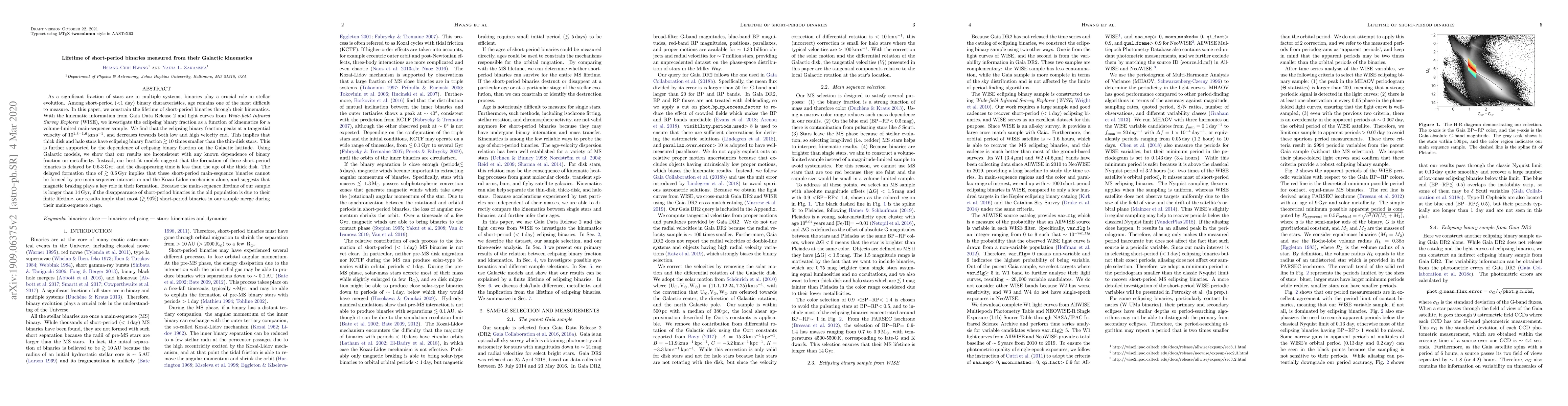As a significant fraction of stars are in multiple systems, binaries play a crucial role in stellar evolution. Among short-period (<1 day) binary characteristics, age remains one of the most difficult to measure. In this paper, we constrain the lifetime of short-period binaries through their kinematics. With the kinematic information from Gaia Data Release 2 and light curves from {\it Wide-field Infrared Survey Explorer} (WISE), we investigate the eclipsing binary fraction as a function of kinematics for a volume-limited main-sequence sample. We find that the eclipsing binary fraction peaks at a tangential velocity of $10^{1.3-1.6}$ km/s, and decreases towards both low and high velocity end. This implies that thick disk and halo stars have eclipsing binary fraction $\gtrsim 10$ times smaller than the thin-disk stars. This is further supported by the dependence of eclipsing binary fraction on the Galactic latitude. Using Galactic models, we show that our results are inconsistent with any known dependence of binary fraction on metallicity. Instead, our best-fit models suggest that the formation of these short-period binaries is delayed by 0.6-3 Gyr, and the disappearing time is less than the age of the thick disk. The delayed formation time of $\gtrsim0.6$ Gyr implies that these short-period main-sequence binaries cannot be formed by pre-main sequence interaction and the Kozai-Lidov mechanism alone, and suggests that magnetic braking plays a key role in their formation. Because the main-sequence lifetime of our sample is longer than 14 Gyr, if the disappearance of short-period binaries in the old population is due to their finite lifetime, our results imply that most ($\gtrsim90$%) short-period binaries in our sample merge during their main-sequence stage.