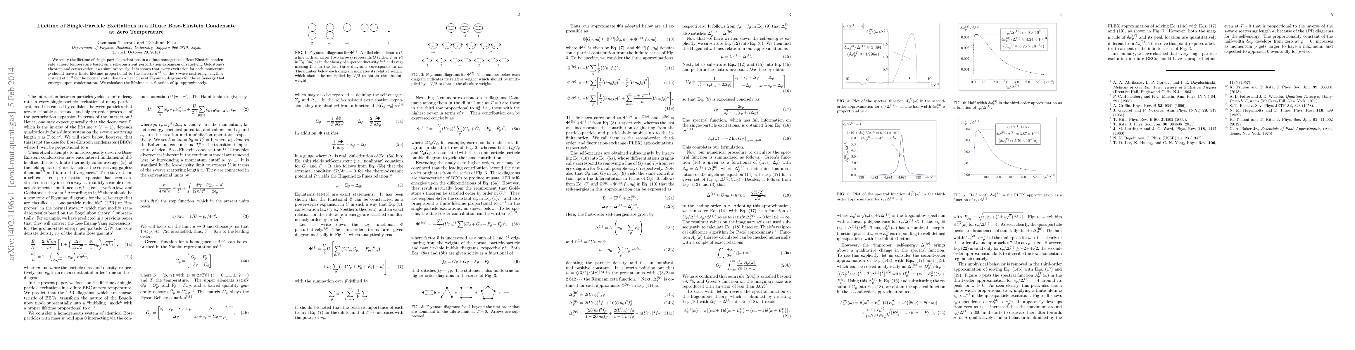 This paper investigates the lifetime of single-particle excitations in a dilute Bose-Einstein condensate at zero temperature, revealing that they have a finite lifetime proportional to the inverse of the s-wave scattering length, differing from the normal state due to unique Feynman diagrams arising from condensation. The lifetime is calculated as a function of momentum.