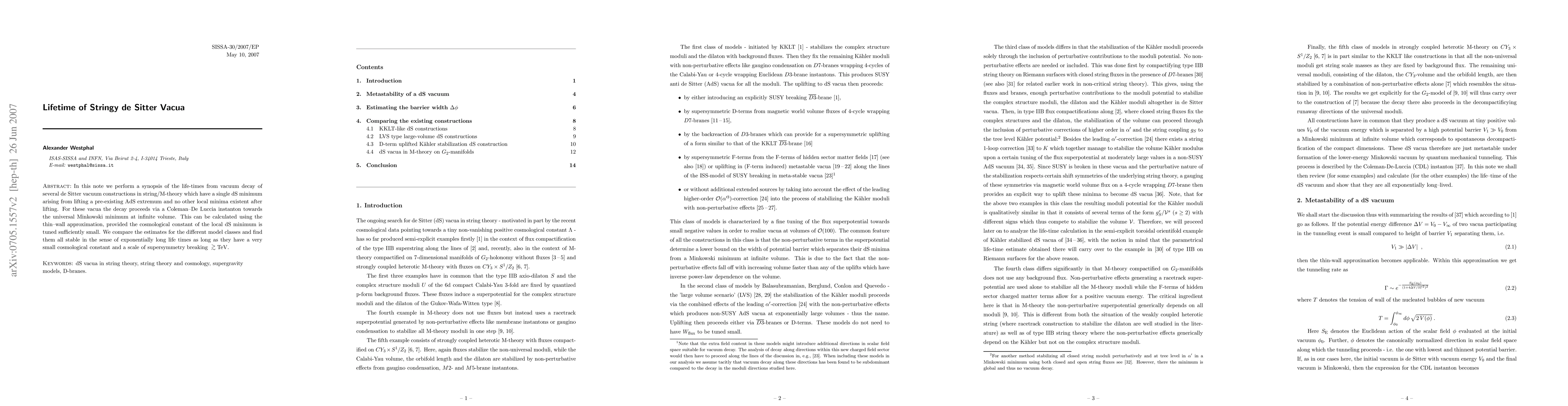 In this note we perform a synopsis of the life-times from vacuum decay of several de Sitter vacuum constructions in string/M-theory which have a single dS minimum arising from lifting a pre-existing AdS extremum and no other local minima existent after lifting. For these vacua the decay proceeds via a Coleman--De Luccia instanton towards the universal Minkowski minimum at infinite volume. This can be calculated using the thin--wall approximation, provided the cosmological constant of the local dS minimum is tuned sufficiently small. We compare the estimates for the different model classes and find them all stable in the sense of exponentially long life times as long as they have a very small cosmological constant and a scale of supersymmetry breaking > TeV.