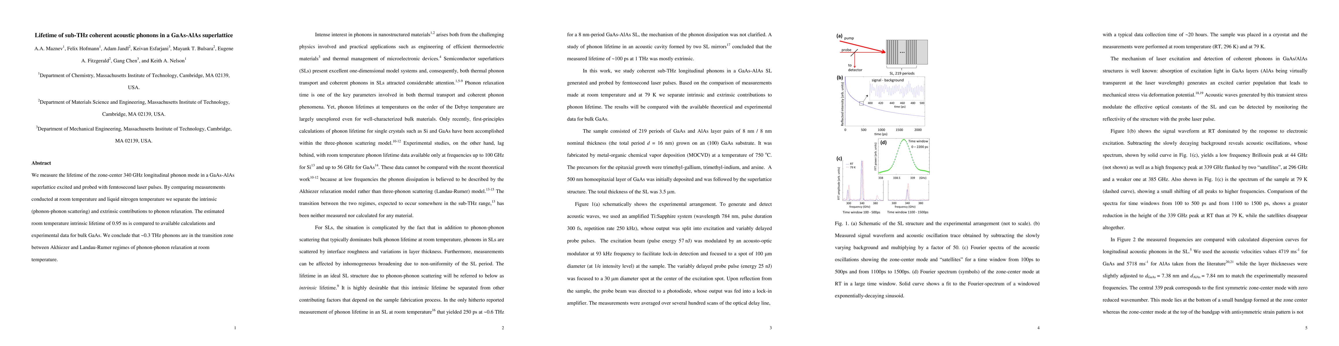This study investigates the lifetime of 340 GHz phonons in a GaAs-AlAs superlattice using femtosecond laser pulses, distinguishing intrinsic and extrinsic relaxation contributions. The intrinsic lifetime at room temperature is found to be 0.95 ns, indicating that ~0.3 THz phonons transition between Akhiezer and Landau-Rumer relaxation regimes.