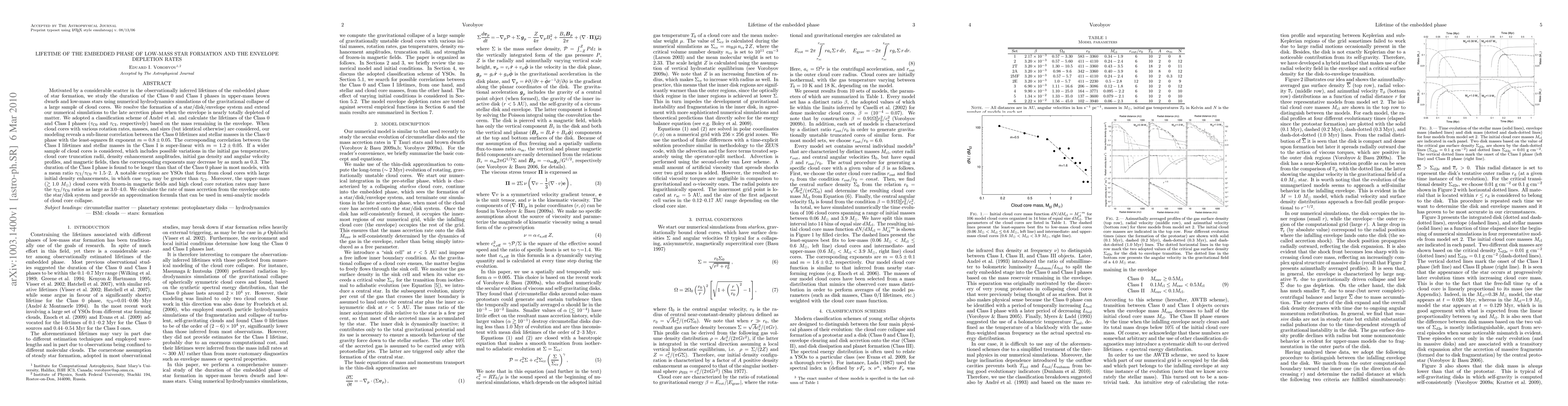 Motivated by a considerable scatter in the observationally inferred lifetimes of the embedded phase of star formation, we study the duration of the Class 0 and Class I phases in upper-mass brown dwarfs and low-mass stars using numerical hydrodynamics simulations of the gravitational collapse of a large sample of cloud cores. We resolve the formation of a star/disk/envelope system and extend our numerical simulations to the late accretion phase when the envelope is nearly totally depleted of matter. We adopted a classification scheme of Andre et al. and calculate the lifetimes of the Class 0 and Class I phases (\tau_C0 and \tau_CI, respectively) based on the mass remaining in the envelope. When cloud cores with various rotation rates, masses, and sizes (but identical otherwise) are considered, our modeling reveals a sub-linear correlation between the Class 0 lifetimes and stellar masses in the Class 0 phase with the least-squares fit exponent m=0.8 \pm 0.05. The corresponding correlation between the Class I lifetimes and stellar masses in the Class I is super-linear with m=1.2 \pm 0.05. If a wider sample of cloud cores is considered, which includes possible variations in the initial gas temperature, cloud core truncation radii, density enhancement amplitudes, initial gas density and angular velocity profiles, and magnetic fields, then the corresponding exponents may decrease by as much as 0.3. The duration of the Class I phase is found to be longer than that of the Class~0 phase in most models, with a mean ratio \tau_CI / \tau_C0 \approx 1.5--2. A notable exception are YSOs that form from cloud cores with large initial density enhancements, in which case \tau_C0 may be greater than \tau_CI. Moreover, the upper-mass (>= 1.0 Msun) cloud cores with frozen-in magnetic fields and high cloud core rotation rates may have the \tau_CI / \tau_C0 ratios as large as 3.0--4.0. (Abdridged).