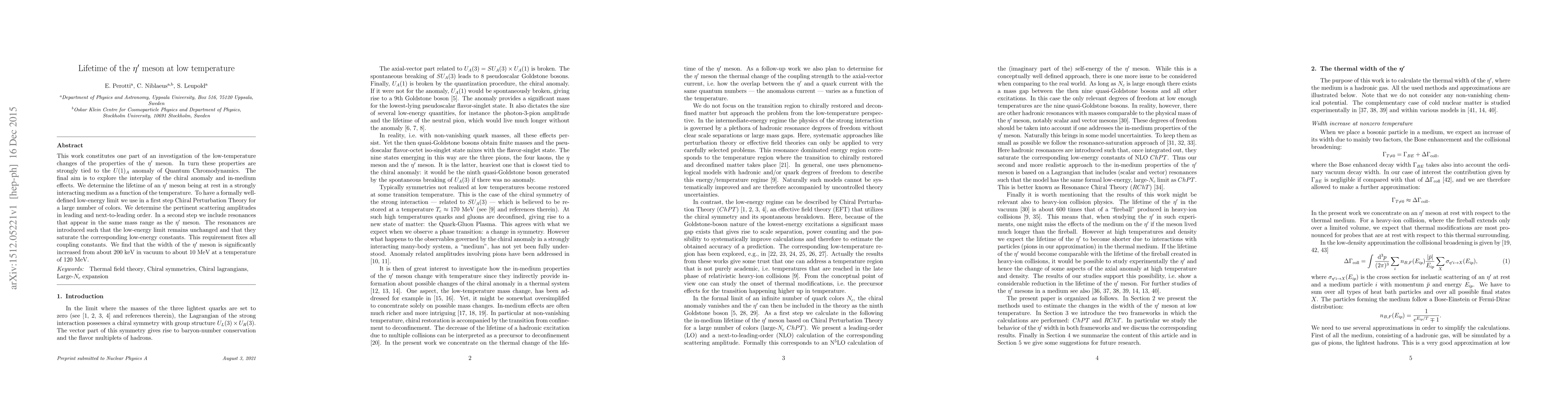 This work constitutes one part of an investigation of the low-temperature changes of the properties of the eta' meson. In turn these properties are strongly tied to the U(1)_A anomaly of Quantum Chromodynamics. The final aim is to explore the interplay of the chiral anomaly and in-medium effects. We determine the lifetime of an eta' meson being at rest in a strongly interacting medium as a function of the temperature. To have a formally well-defined low-energy limit we use in a first step Chiral Perturbation Theory for a large number of colors. We determine the pertinent scattering amplitudes in leading and next-to-leading order. In a second step we include resonances that appear in the same mass range as the eta' meson. The resonances are introduced such that the low-energy limit remains unchanged and that they saturate the corresponding low-energy constants. This requirement fixes all coupling constants. We find that the width of the eta' meson is significantly increased from about 200 keV in vacuum to about 10 MeV at a temperature of 120 MeV.