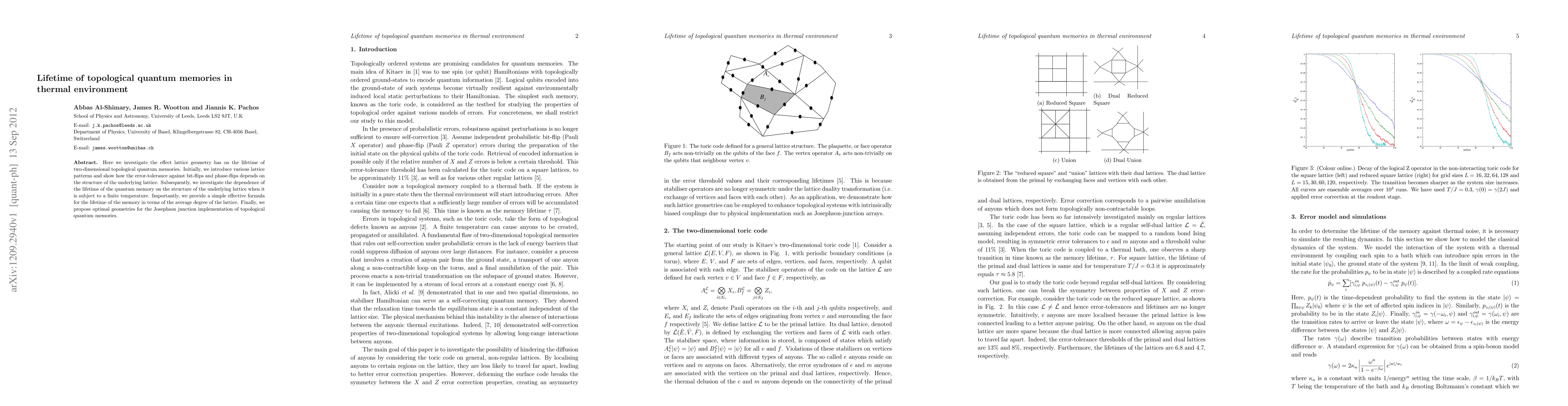 Here we investigate the effect lattice geometry has on the lifetime of two-dimensional topological quantum memories. Initially, we introduce various lattice patterns and show how the error-tolerance against bit-flips and phase-flips depends on the structure of the underlying lattice. Subsequently, we investigate the dependence of the lifetime of the quantum memory on the structure of the underlying lattice when it is subject to a finite temperature. Importantly, we provide a simple effective formula for the lifetime of the memory in terms of the average degree of the lattice. Finally, we propose optimal geometries for the Josephson junction implementation of topological quantum memories.