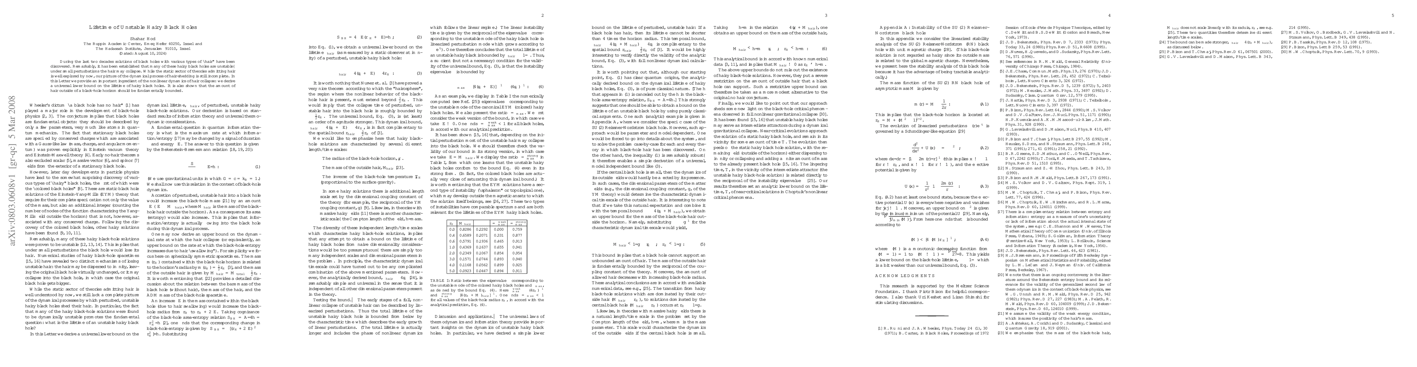 The research derives a universal lower bound on the lifetime of perturbed, unstable hairy black holes using analytical methods, starting from a fundamental equation (1) with quantum origins that simplifies to a purely classical bound for the lifetime (τhair ≥ 4rH).