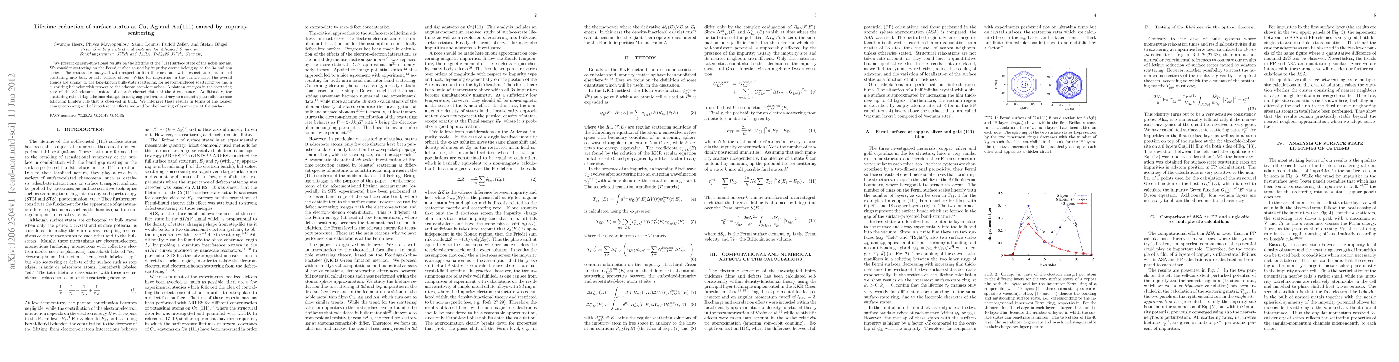 We present density-functional results on the lifetime of the (111) surface state of the noble metals. We consider scattering on the Fermi surface caused by impurity atoms belonging to the 3d and 4sp series. The results are analyzed with respect to film thickness and with respect to separation of scattering into bulk or into surface states. While for impurities in the surface layer the overall trends are similar to the long-known bulk-state scattering, for adatom-induced scattering we find a surprising behavior with respect to the adatom atomic number. A plateau emerges in the scattering rate of the 3d adatoms, instead of a peak characteristic of the d resonance. Additionally, the scattering rate of 4sp adatoms changes in a zig-zag pattern, contrary to a smooth parabolic increase following Linde's rule that is observed in bulk. We interpret these results in terms of the weaker charge-screening and of interference effects induced by the lowering of symmetry at the surface.