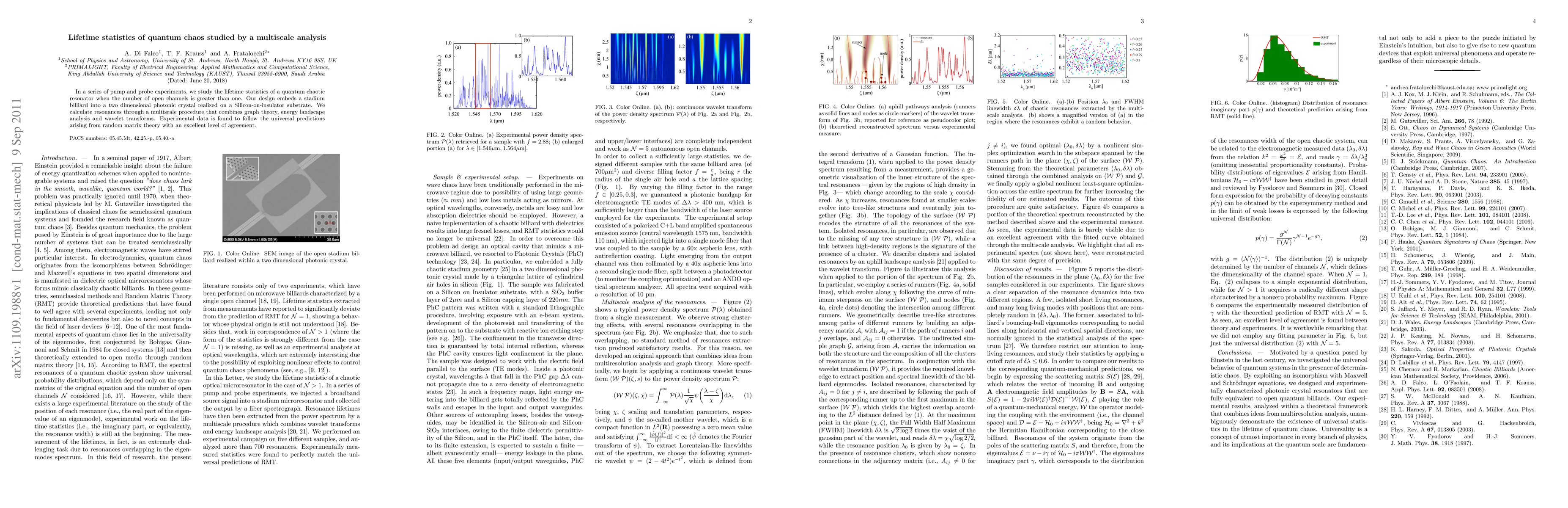 In a series of pump and probe experiments, we study the lifetime statistics of a quantum chaotic resonator when the number of open channels is greater than one. Our design embeds a stadium billiard into a two dimensional photonic crystal realized on a Silicon-on-insulator substrate. We calculate resonances through a multiscale procedure that combines graph theory, energy landscape analysis and wavelet transforms. Experimental data is found to follow the universal predictions arising from random matrix theory with an excellent level of agreement.