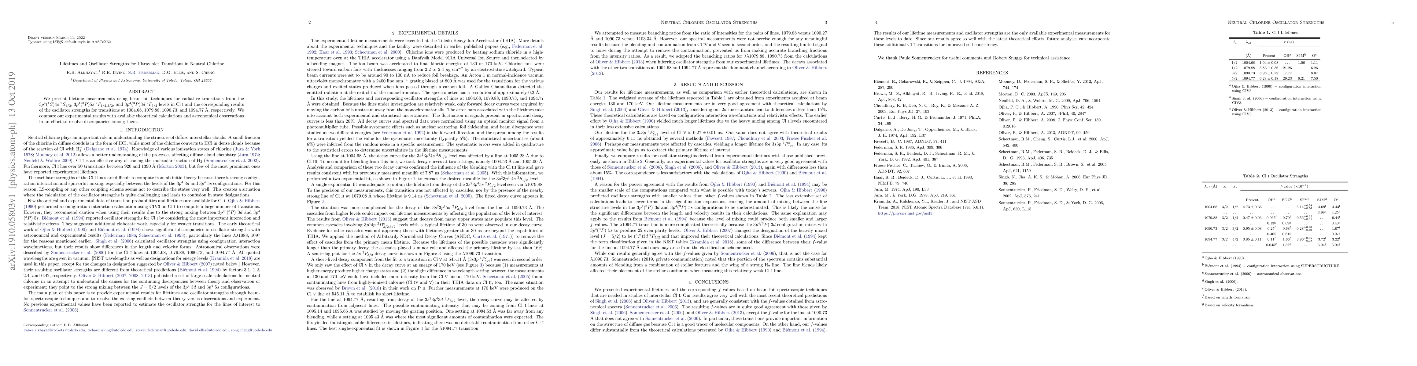 We present lifetime measurements using beam-foil techniques for radiative transitions from the 3$p^4$($^1S$)4$s$ $^2S_{1/2}$, 3$p^4$($^3P$)5$s$ $^2P_{1/2,3/2}$, and 3$p^4$($^3P$)3$d$ $^2F_{5/2}$ levels in Cl I and the corresponding results of the oscillator strengths for transitions at 1004.68, 1079.88, 1090.73, and 1094.77 \AA, respectively. We compare our experimental results with available theoretical calculations and astronomical observations in an effort to resolve discrepancies among them.