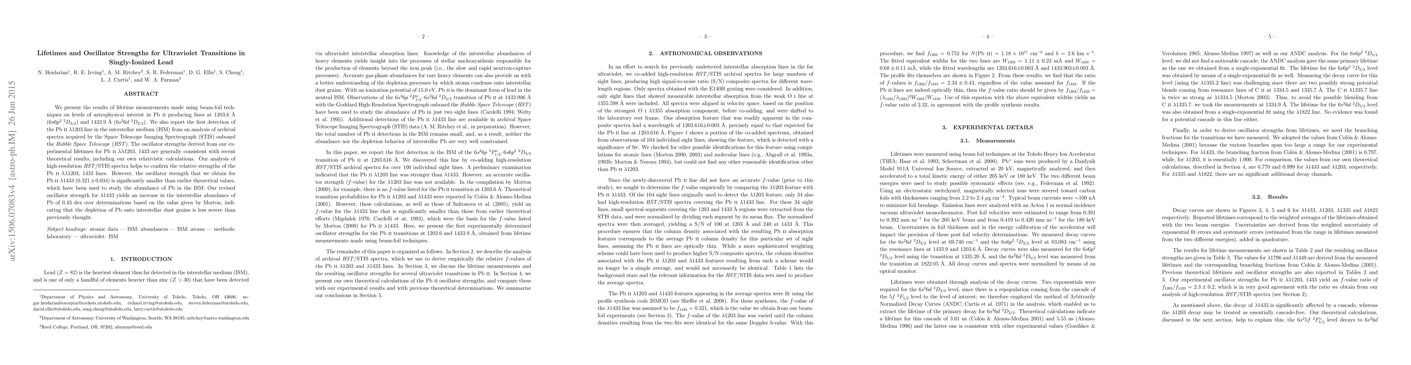 We present the results of lifetime measurements made using beam-foil techniques on levels of astrophysical interest in Pb II producing lines at 1203.6 A ($6s6p^{2}$ $^{2}D_{3/2}$) and 1433.9 A ($6s^{2}6d$ $^{2}D_{3/2}$). We also report the first detection of the Pb II $\lambda1203$ line in the interstellar medium (ISM) from an analysis of archival spectra acquired by the Space Telescope Imaging Spectrograph (STIS) onboard the Hubble Space Telescope (HST). The oscillator strengths derived from our experimental lifetimes for Pb II $\lambda\lambda1203$, $1433$ are generally consistent with recent theoretical results, including our own relativistic calculations. Our analysis of high-resolution HST/STIS spectra helps to confirm the relative strengths of the Pb II $\lambda\lambda 1203$, $1433$ lines. However, the oscillator strength that we obtain for Pb II $\lambda1433$ ($0.321\pm0.034$) is significantly smaller than earlier theoretical values, which have been used to study the abundance of Pb in the ISM. Our revised oscillator strength for $\lambda1433$ yields an increase in the interstellar abundance of Pb of 0.43 dex over determinations based on the value given by Morton, indicating that the depletion of Pb onto interstellar dust grains is less severe than previously thought.