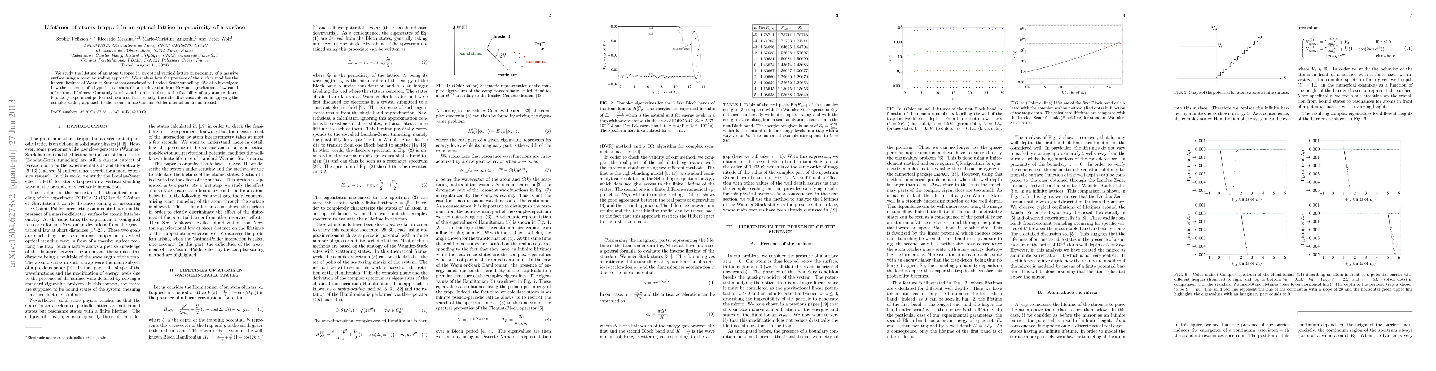 We study the lifetime of an atom trapped in an optical vertical lattice in proximity of a massive surface using a complex scaling approach. We analyze how the presence of the surface modifies the known lifetimes of Wannier-Stark states associated to Landau-Zener tunnelling. We also investigate how the existence of a hypothetical short-distance deviation from Newton's gravitational law could affect these lifetimes. Our study is relevant in order to discuss the feasibility of any atomic- interferometry experiment performed near a surface. Finally, the difficulties encountered in applying the complex-scaling approach to the atom-surface Casimir-Polder interaction are addressed.