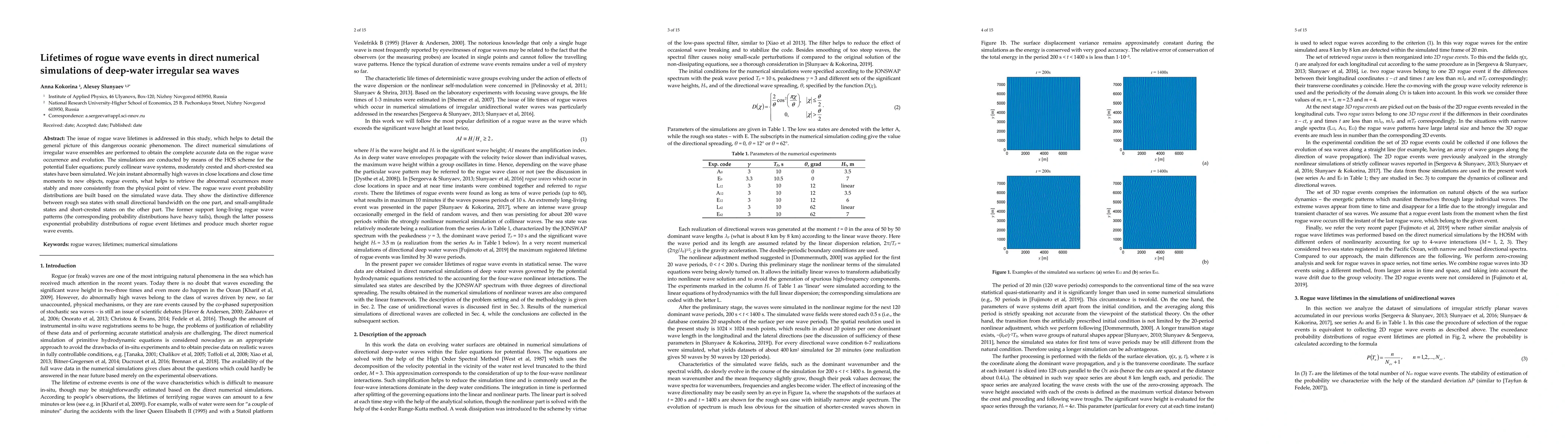 This study investigates rogue wave lifetimes through direct numerical simulations of deep-water irregular sea waves, revealing that rogue wave events in narrow directional bandwidths sustain longer periods, while those in short-crested or small-amplitude states exhibit shorter, exponentially distributed lifetimes.